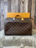 This is the name of a HANDBag Luxury DESIGNER from the brand Louis Vuitton. The color is MONOGRAM and it comes in a LARGE size. It's also known as the SPEEDY 35.