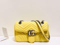Pastels push the color in soft, vibrant hues. Made in matelassé chevron leather with a heart on the back in a light shade, the now recognizable GG Marmont chain shoulder bag has a softly structured shape and a flap closure with Double G hardware. Designed to be multiple ways, the chain strap slides to change between a shoulder and a top handle bag.