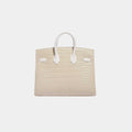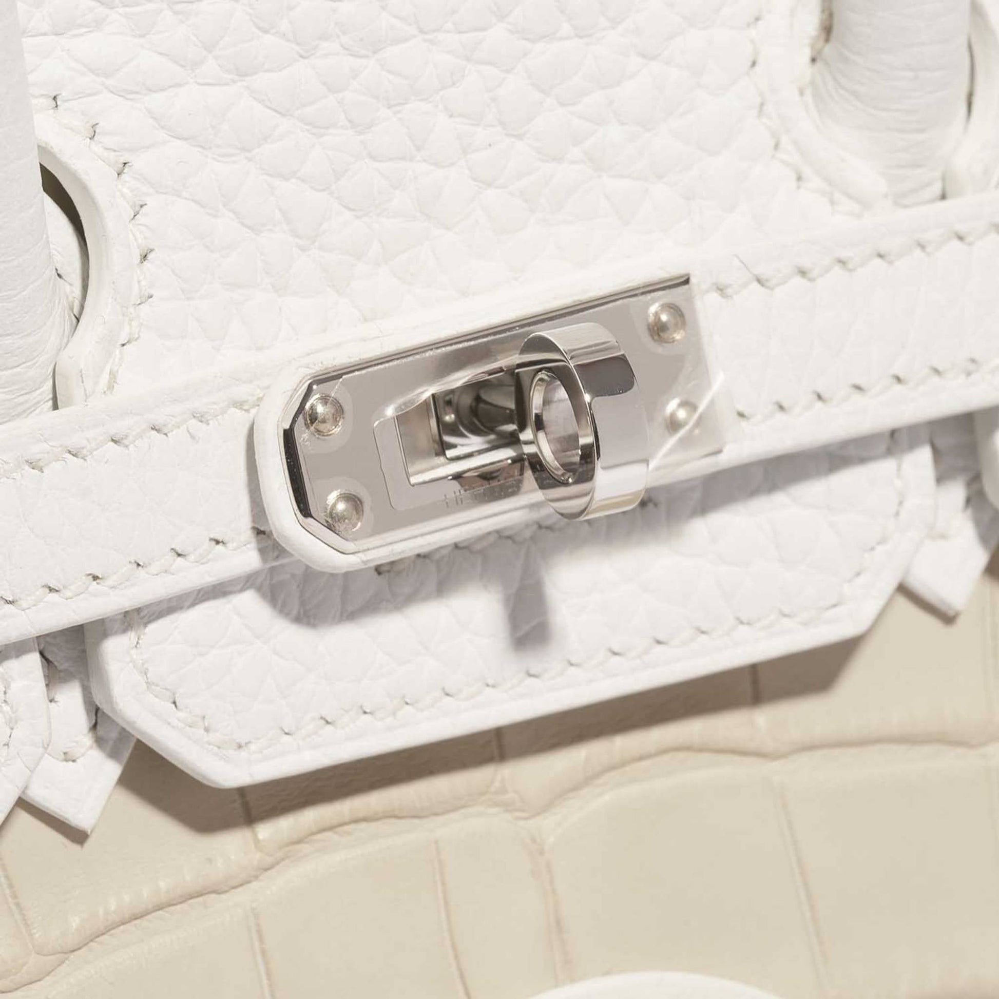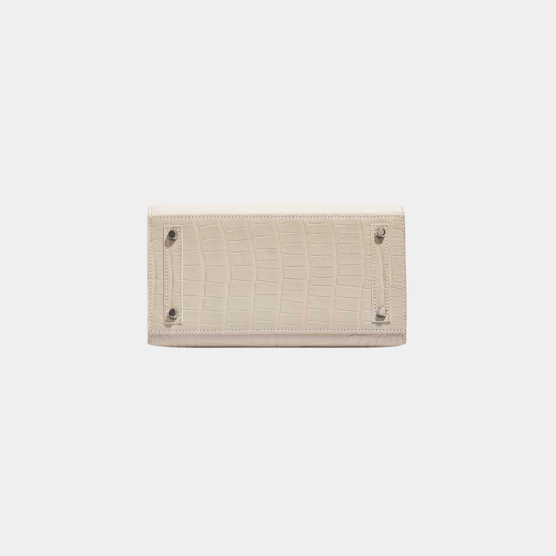 The Birkin 20 Faubourg Snow White Sous La Neige showcases Hermès’ commitment to haute craftsmanship, blending multiple textures, finishes, and colors into a seamless architectural design. Every detail—from the hand-stitched alligator panels to the signature rolled leather handles—demonstrates the meticulous artistry of Hermès artisans.
