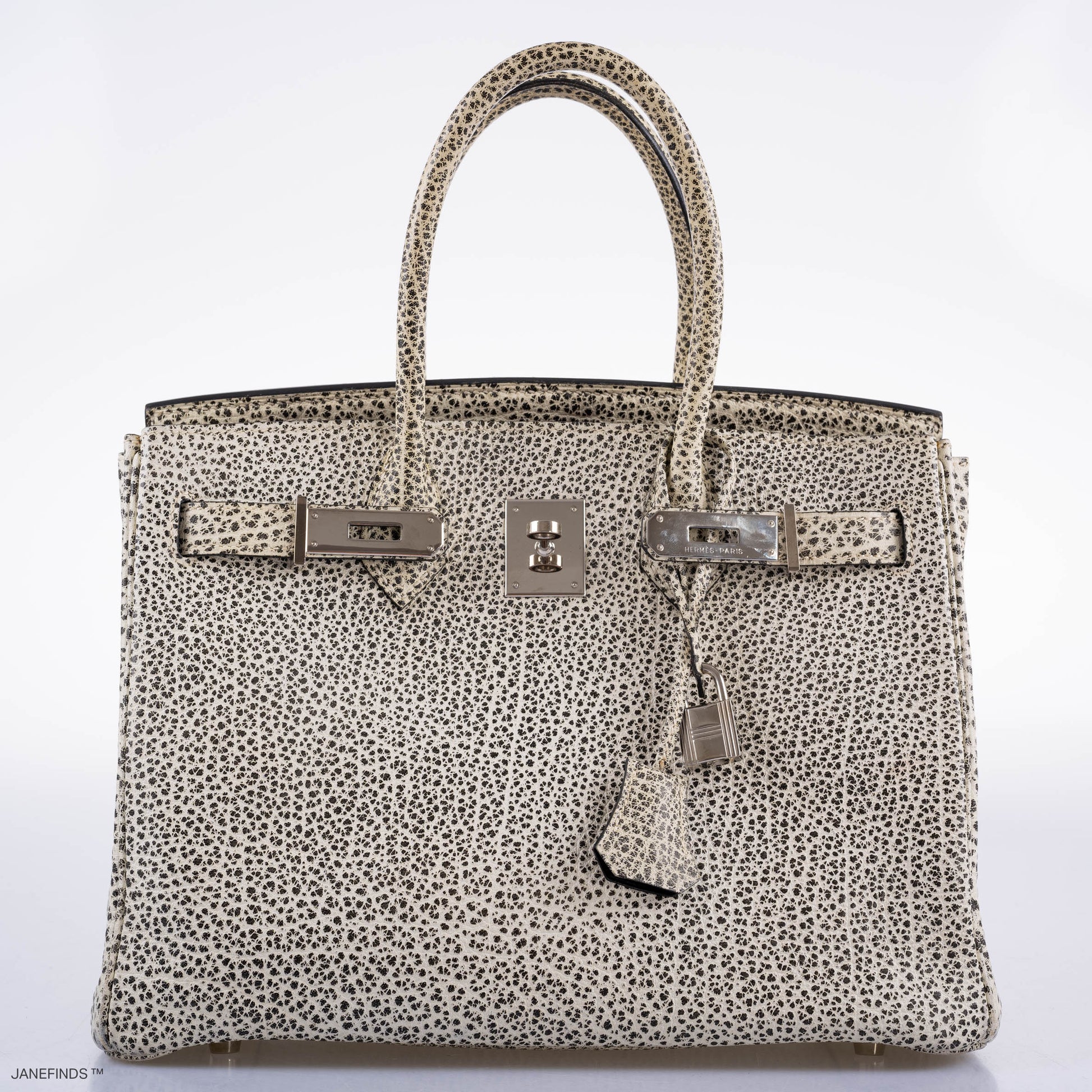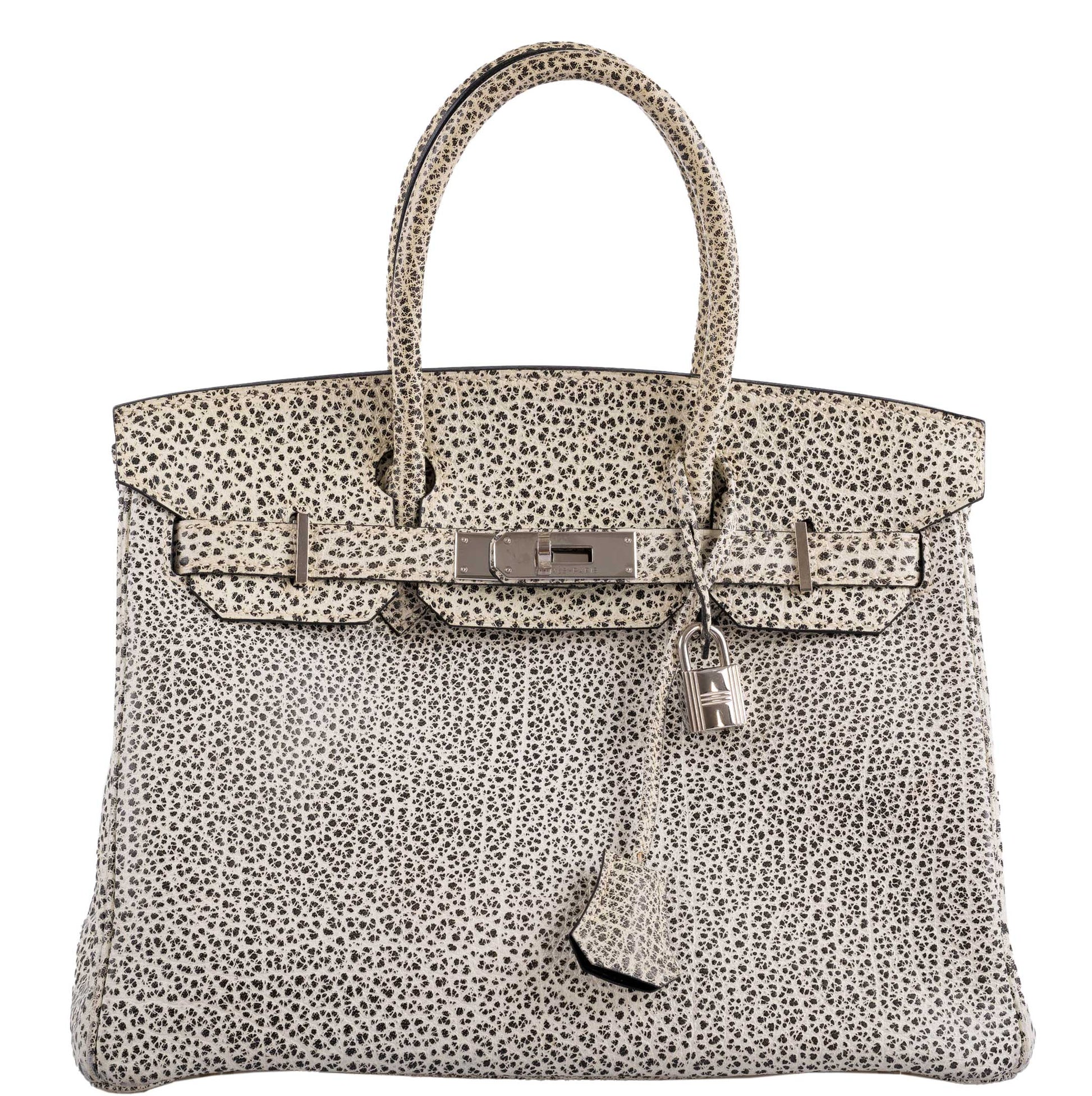 Around the turn of the century, Hermès developed an unusual dyeing process which they applied to buffalo leather for a wholly new and exciting effect. Through a special treatment, they were able to dye the naturally pebbled leather twice in succession, with white and a contrasting color creating a spotted pattern along the grain. Absolutely covered in spots, the bags created from this material were called Dalmatian bags, or Dalmatien in French. Hermès produced a few of their handbag styles in this material, which came with contrasting black, orange, red, and green spots. This is a rare example of a 35cm Dalmatian Birkin in the white and black color-way. It features gold hardware which is unusual for Dalmatian bags, and handles that have been freshly replaced by Hermès. The interior matches with the spots, black Chevre leather, and houses the brand stamp, which Hermès moved inside the bag as it would disrupt the spotting pattern on the front. Hermès produced their last Dalmatian bags in 2008, after numbers had been dwindling for years. Today, these bags are highly sought after by collectors looking for truly unusual pieces.