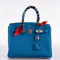 Hermès is renowned for its exceptional use of color in its luxury goods, particularly in its selection of blues, which encompasses over forty distinct shades. Some hues, such as Blue Jean and Blue Marine, have been produced for decades, while others are more elusive, appearing only for a single season before becoming scarce. The 30cm Togo leather Birkin featured here is finished in Blue Zanzibar, a rare and highly sought-after shade that is known for its rich, saturated blue tones with subtle undertones of turquoise and green, evocative of the Indian Ocean. The bag is elegantly accented with Palladium hardware and is in "Store Fresh" condition.