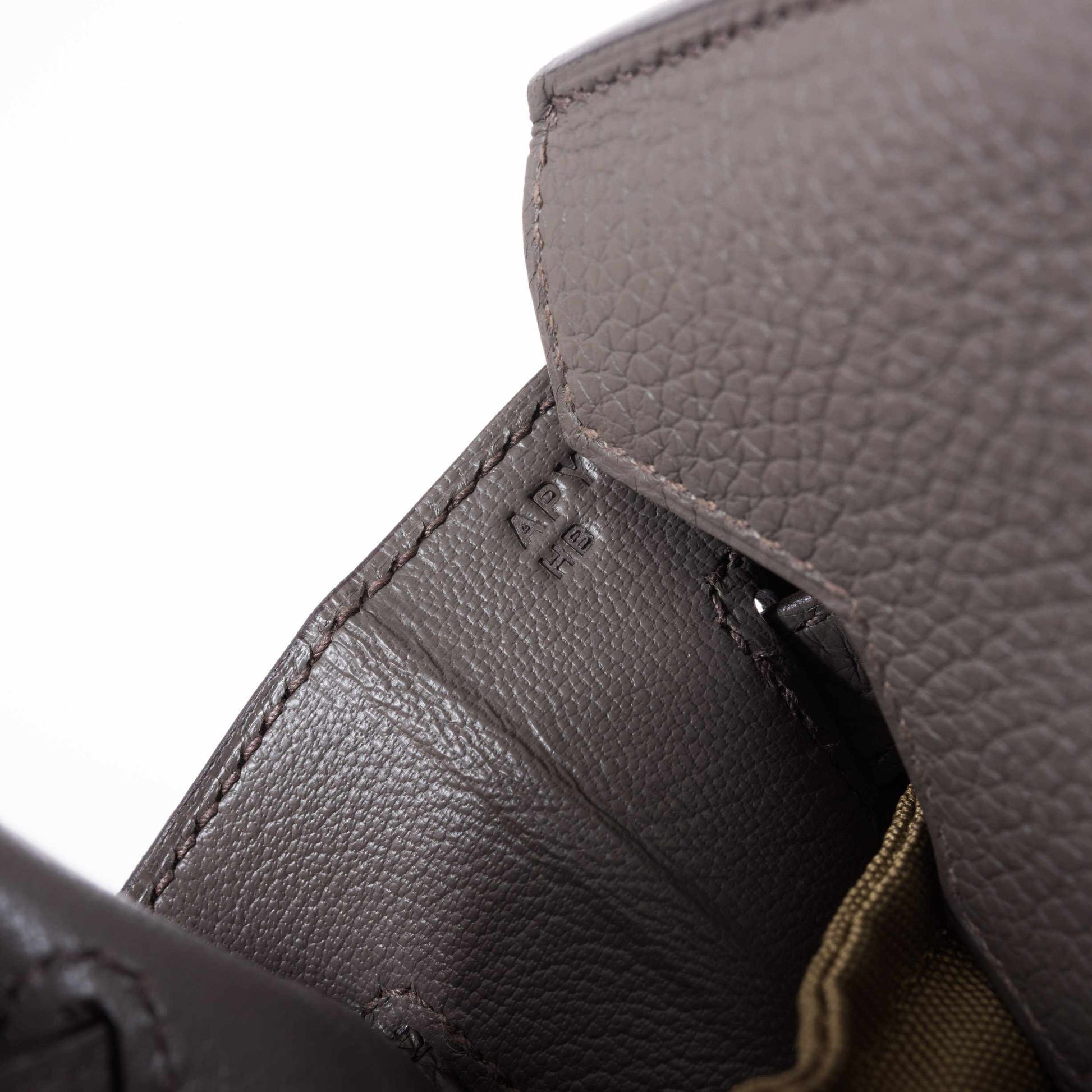 A favorite from Hermès... Etain is a tin grey that subtle and understated, this color in 30cm is sophisticated elegance at its best. Tonal stitching, a front toggle closure, a clochette with lock and two keys, and double rolled handles. The interior is lined with Etain chevre and has one zip pocket with an Hermès engraved zipper pull and an open pocket on the opposite side.