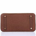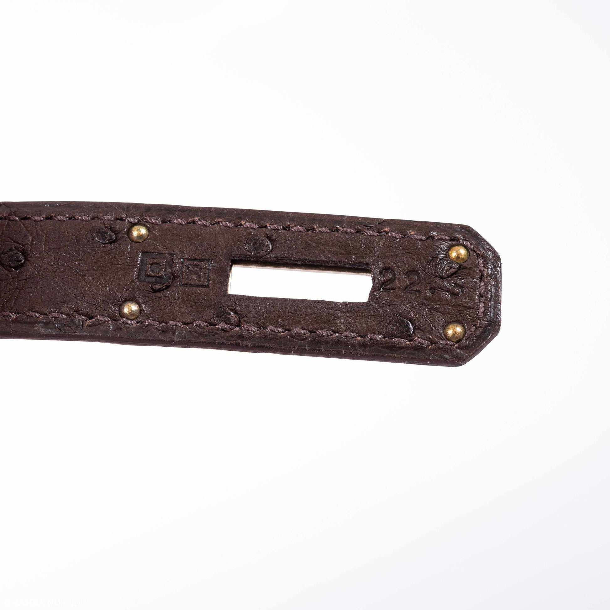 One of the most stunning creations from Hermès, a special edition Ghillies no longer produced. Marron Fonce ostrich Hermès Ghillies Birkin 30 with Champagne gold -plated hardware, dual rolled Etrusque ostrich handles, Mousse ostrich brogue detail throughout, Marron Fonce Chevre leather interior, dual pockets at interior walls, one with zip closure and flap with turn-lock closure at front.
