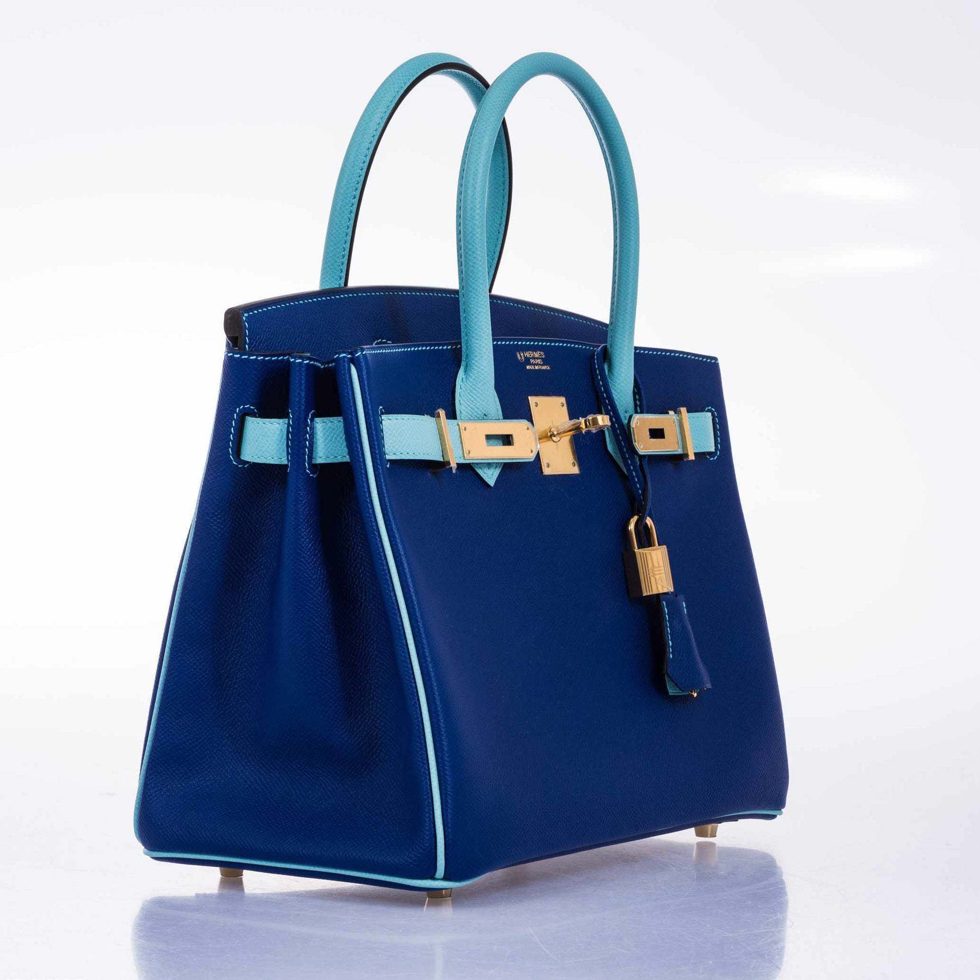 One of our favorites from Hermès, a stunning combination... Hermès Horseshoe Stamp (HSS) special order Bi-Color Birkin 30cm Blue Electric and Blue Atoll epsom leather with gold hardware and contrast stitching. The interior is lined with Blue Atoll chevre and has one zip pocket with an Hermès engraved pull and an open pocket on the opposite side.