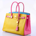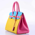 It was only a few years ago that Hermès stopped allowing special order bags with three colors, and already spotting one on the secondary market has become a rare experience. This neon 30cm Birkin is an excellent example of how fun those tri-color bags can be. Executed in Chevre leather, a glossy goat skin that displays color brilliantly and is reserved for HSS bags, this Birkin takes full advantage of the special order process, adding contrast stitching and brushed gold hardware to a body of Cumin, Blue Aztec, and Rose Lipstick. Still in fresh condition as though it was just recently produced, this exciting Birkin is a very special and truly unusual piece.