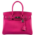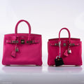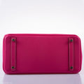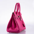 The Hermès Birkin in Rose Tyrien—definitely an eye-catcher and a bold style statement from their 2011 Candy Collection. This 30cm Epsom iteration is a pristine showcase of the hue, further accentuated by white contrast stitching and gleaming gold hardware. It's not just pink; it's a pink that comes alive, especially under blacklight, making it a stunner whether you're in daylight or dancing the night away in a club. The vividness of Rose Tyrien sets it apart, positioning this Birkin as not just an accessory but a focal point that commands attention.