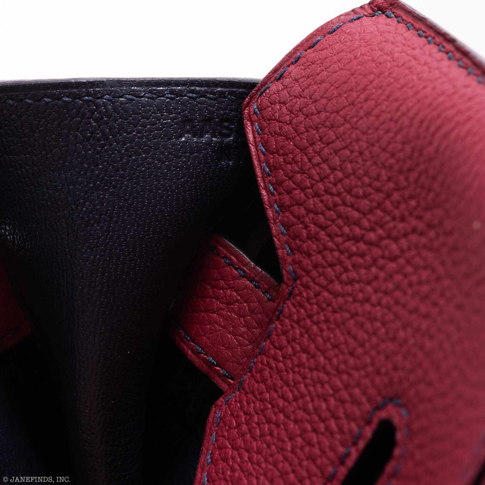 One of our favorites from Hermès, a stunning combination... Hermès Horseshoe Stamp (HSS) special order Bi-Color Birkin 30cm Rouge Grenat And Blue Nuit Togo leather with gold hardware and contrast stitching. The interior is lined with chevre Blue Nuit and has one zip pocket with an Hermès engraved pull and an open pocket on the opposite side.