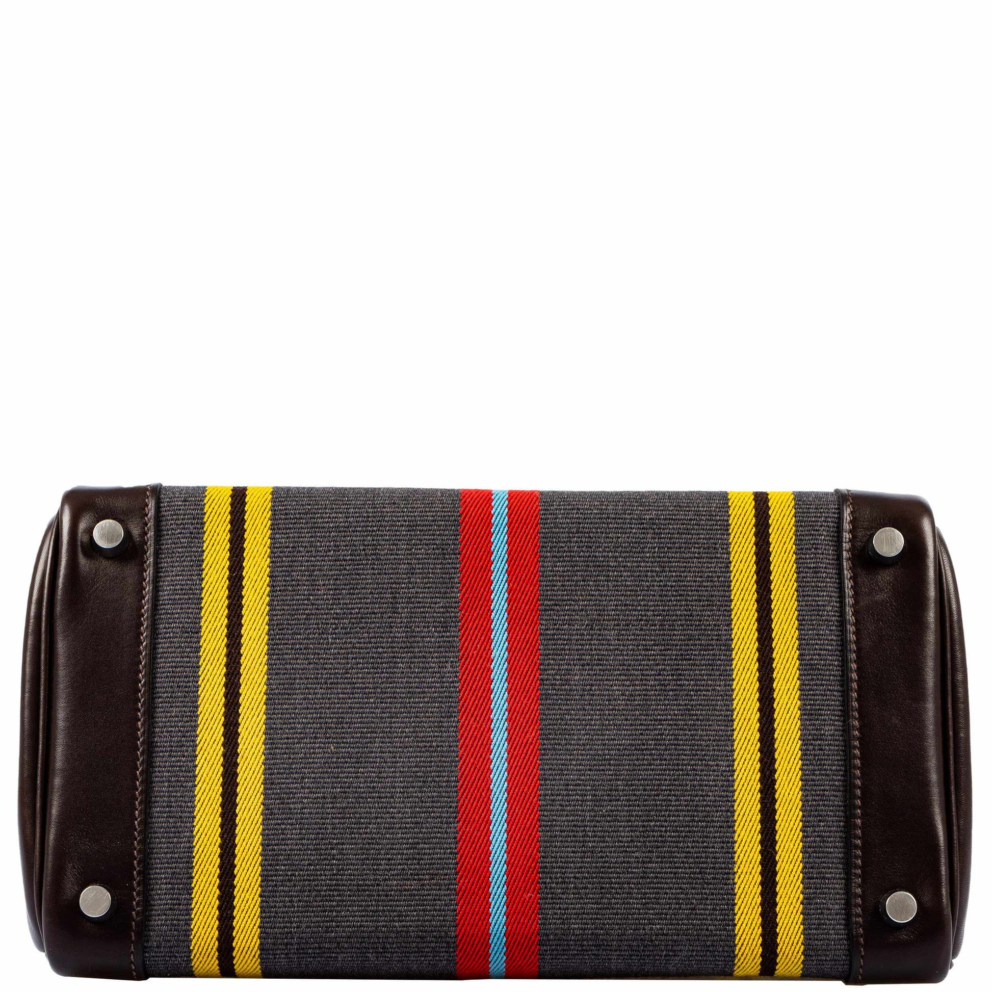 This is a very rare limited edition Birkin with a colorful and sporting wool Jumping canvas body and Marron Fonce Calf box trim. A few canvas Birkin's with different patterns were produced in the early 2000’s, mostly in small HAC Birkin's, so finding a 30cm Birkin is extremely special. Further, this is the most colorful version of the jumping canvas pattern, so we have an extremely special piece here, that is all at once sporting, colorful, casual, and extremely rare.