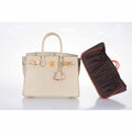 Parchment is a gorgeous neutral coloration, with pleasant warm undertone that is simply amazing. This bag is done in Parchment Ostrich, featuring two rolled handles, Gold Hardware, and a flap top with a turnlock closure. The interior is done in Parchment Chevre Leather, featuring one zip pocket and one slip pocket.