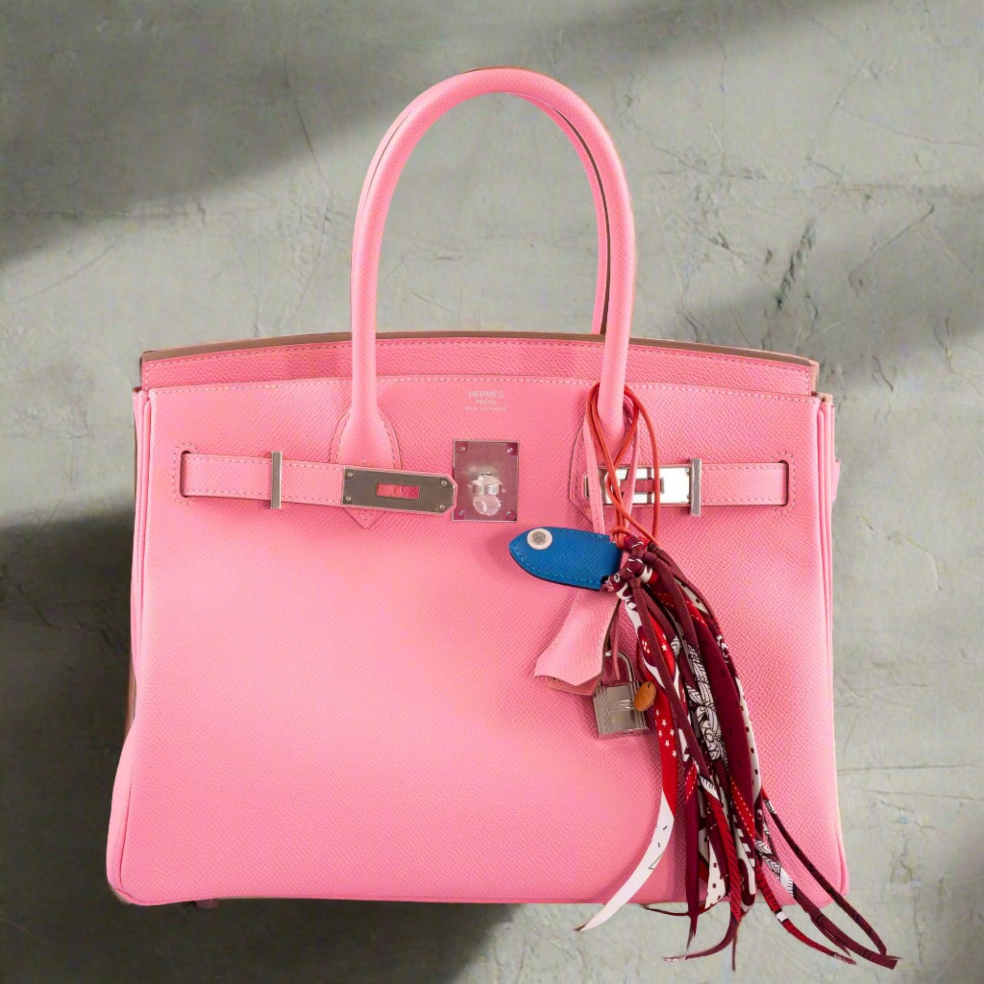 This Hermes Birkin 30 in Rose Confetti Epsom leather is a symphony in pink, casting a spell of timeless charm and modern femininity. This 2021 model marries the brand's storied craftsmanship with a playful hue, making it a quintessential piece for those who adore a touch of whimsy in their collection. The Rose Confetti color is a delicate pink that exudes a youthful exuberance, while the Epsom leather's fine-grained texture ensures durability and a strong color throughout. Coupled with the gleaming palladium hardware, this Birkin bag shines with an understated elegance that is both eye-catching and refined. This Birkin is not just a statement piece but a versatile companion that brings a luxurious flourish to every occasion, securing its place as a beloved jewel in the crown of Hermes aficionados.