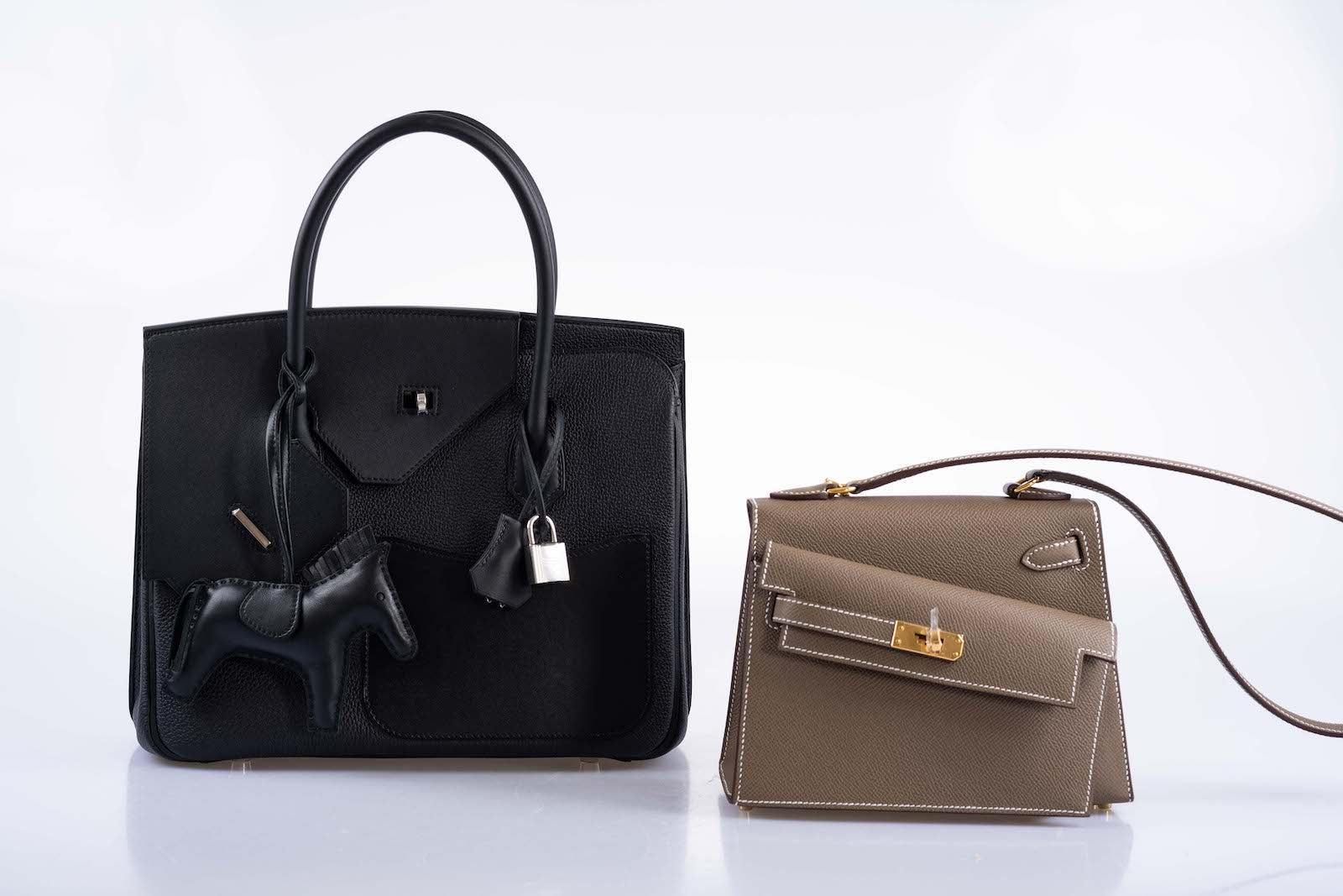 This Hermès Birkin en Désordre is a testament to the brand's innovative spirit, expertly blending tradition with avant-garde aesthetics. The bag’s body, crafted from the exquisite Black Togo leather, is known for its fine grain and durability, presenting a canvas of profound depth and resilience. This 2023 creation takes an unorthodox approach, breaking the mold with its Swift leather accents arranged in a seemingly haphazard fashion that challenges the conventions of luxury design. The palladium hardware adds a contemporary edge, its cool, silvery tones accentuating the structured silhouette. The bag's unique composition, with pockets and flaps adorning its exterior in an unusual yet artistic arrangement, invites both curiosity and admiration. It is a piece that doesn’t just sit in the echelons of high fashion but converses with the space, creating a narrative of its own. The Hermès Birkin en Désordre isn’t merely a bag; it is an exploration of form and function, an emblem of the brand’s relentless pursuit of innovation within the revered boundaries of luxury.
