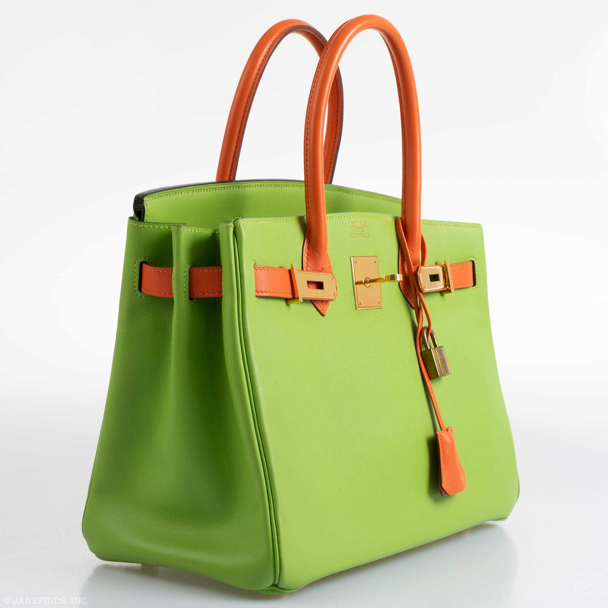Nobody does color like Hermès, and the 1990's was the house's age of color enlightenment. The two most powerful shades to emerge from this formative era were also two shade that miraculously withstand the dulling effects of time: Orange H (Orange d' Hermès if you'd prefer. You may recognize it from the boxes?) and Vert Cru, also know as Granny or Apple green. Hermès knew these two colors were bangers and made a bold historical move in producing a very limited series of their classic bags pairing the two. Yet somehow this most absurd of combinations has become one of the most classic and instantly recognizable. This 30cm Birkin features the two shades in Gulliver leather (The vintage equivalent of Swift leather - Gulliver's Travels was written by Johnathan Swift, see what they did there?), and has been kept in exquisite condition. This bag is a prime example of this formative era in Hermès' history.