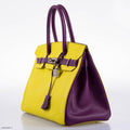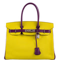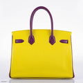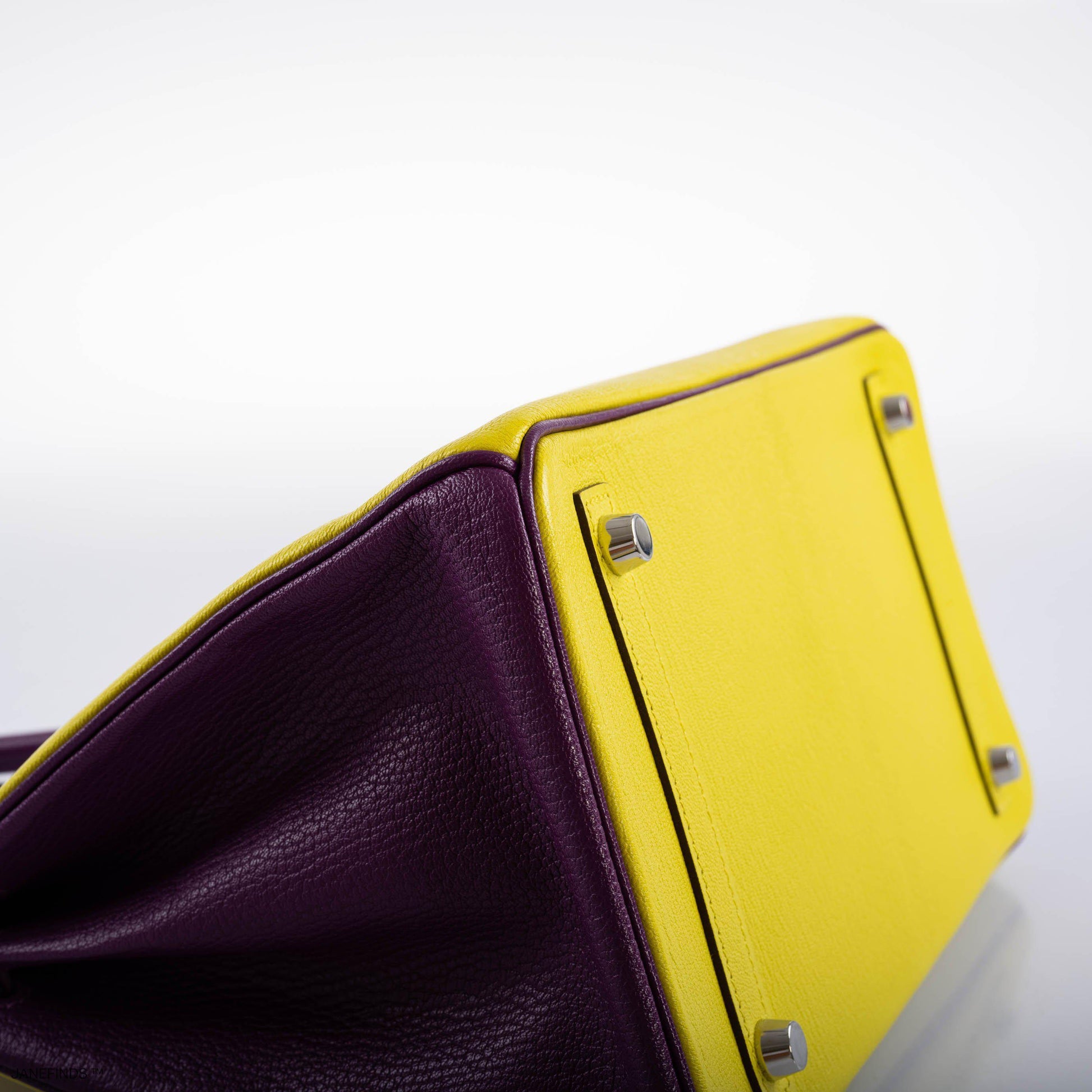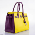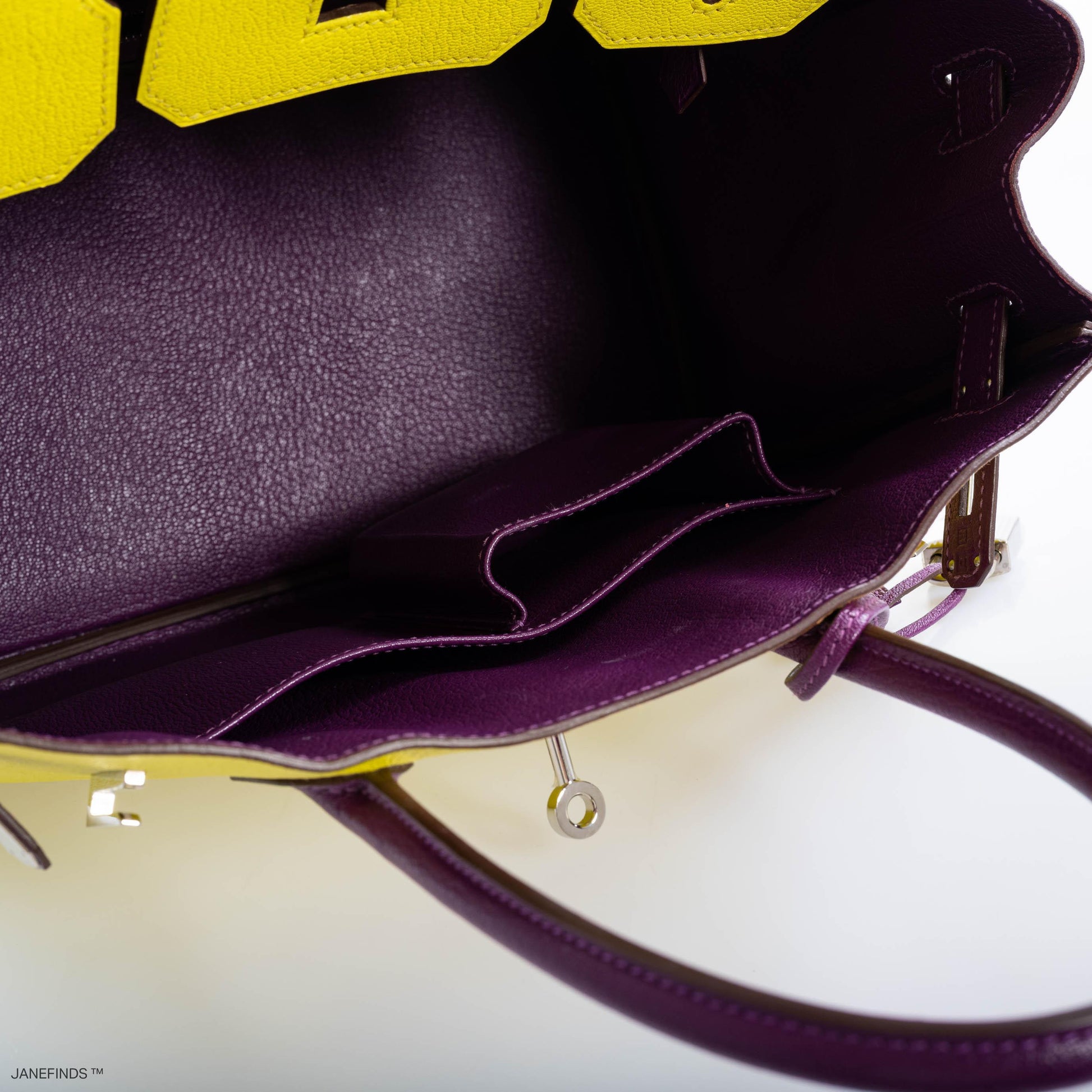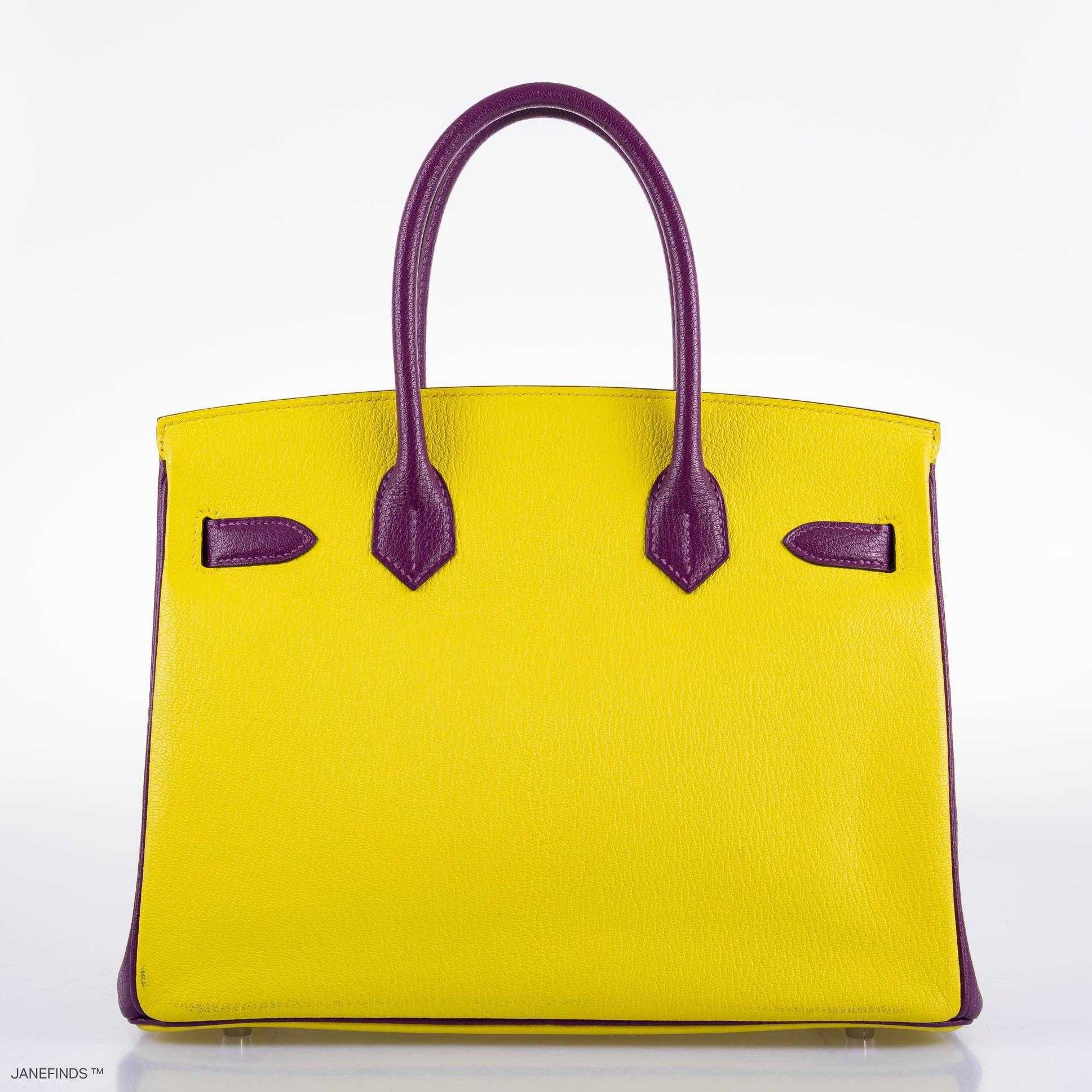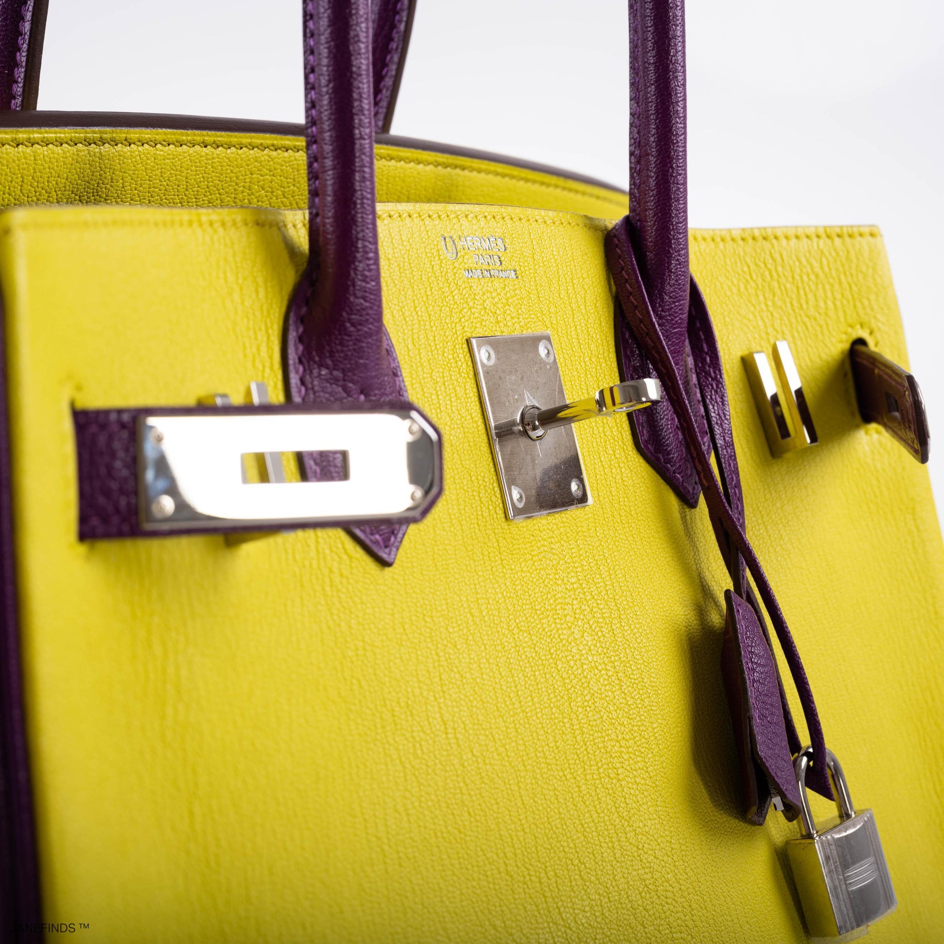 This Hermes HSS (Horseshoe Stamp) Custom Birkin 30, crafted in 2014, is a vibrant and bespoke expression of the iconic Birkin bag. This custom piece beautifully combines Lime and Anemone Chevre leather, resulting in a handbag that is both eye-catching and exquisitely elegant. The Lime Chevre leather, known for its fine grain and durability, presents a bright and vivid green that adds a lively and playful character to the bag. This striking hue is perfectly balanced by the Anemone Chevre, a deep and sophisticated purple, providing a bold and beautiful contrast. The combination of these two vibrant colors creates a bag that is not only visually stunning but also uniquely personal. Accentuated with Palladium Hardware, this Birkin exudes a contemporary elegance. The hardware's sleek and lustrous finish complements the bright colors of the bag, adding a touch of modern sophistication and ensuring the bag’s details are as refined as its overall appearance. This is more than just a handbag; it's a reflection of personal style and a testament to Hermes' commitment to bespoke luxury, appealing to those who appreciate vibrant colors and personalized fashion statements.