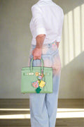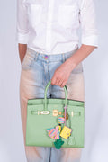 Elevate your ensemble with this Hermes Vert Criquet Birkin by pairing it with a tailored charcoal gray blazer, a silk camisole in a complementary shade, and high-waisted black trousers. Complete the look with pointed-toe pumps and delicate gold jewelry, such as a layered necklace and stud earrings, to accentuate the bag's luxurious appeal. This sophisticated outfit is perfect for a business meeting or a formal dinner, allowing the vibrant green of the Birkin to stand out elegantly.