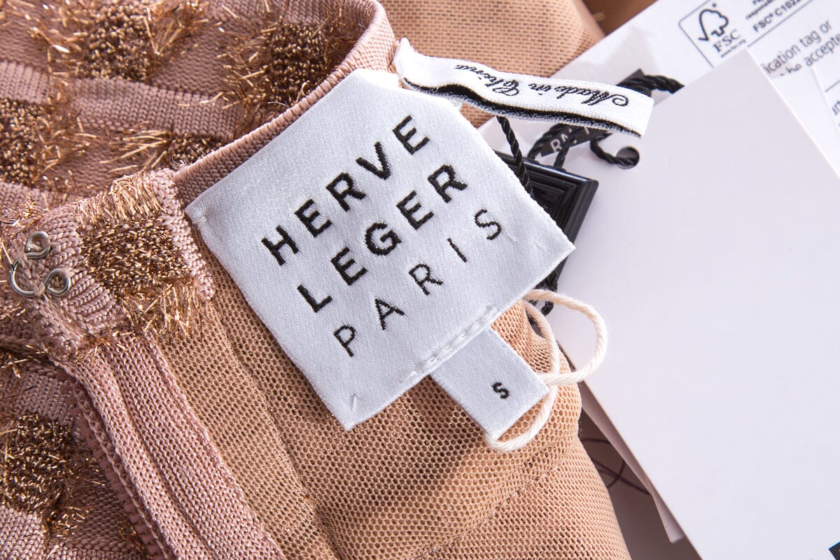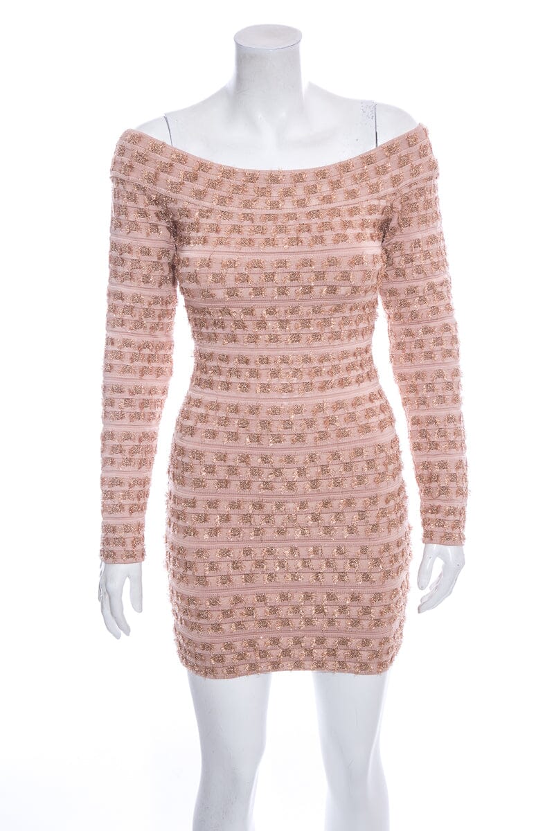 Herve Leger Nude Off the Shoulder Mini Dress with Shimmer Throughout. This item is new with tags.