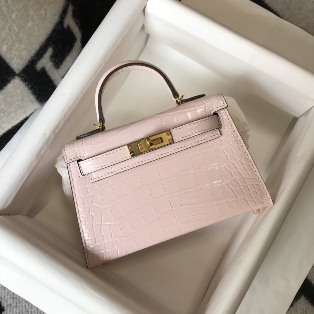 HRMS Mini Kelly 19 Embossed Patent Pink Matte Bag With Gold-Toned Harware For Women, Handbags, Shoulder Bags 7.5in/19cm