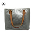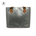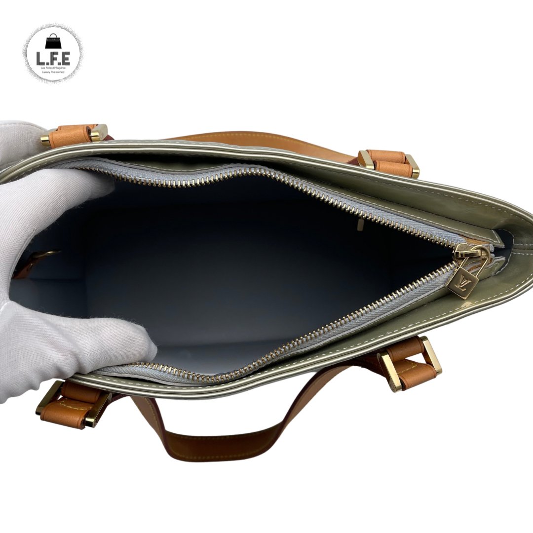 Ce sac est vernis avec des motif monogram, la bijouterie est dorée. Il a deux anses en cuir de couleur marron.