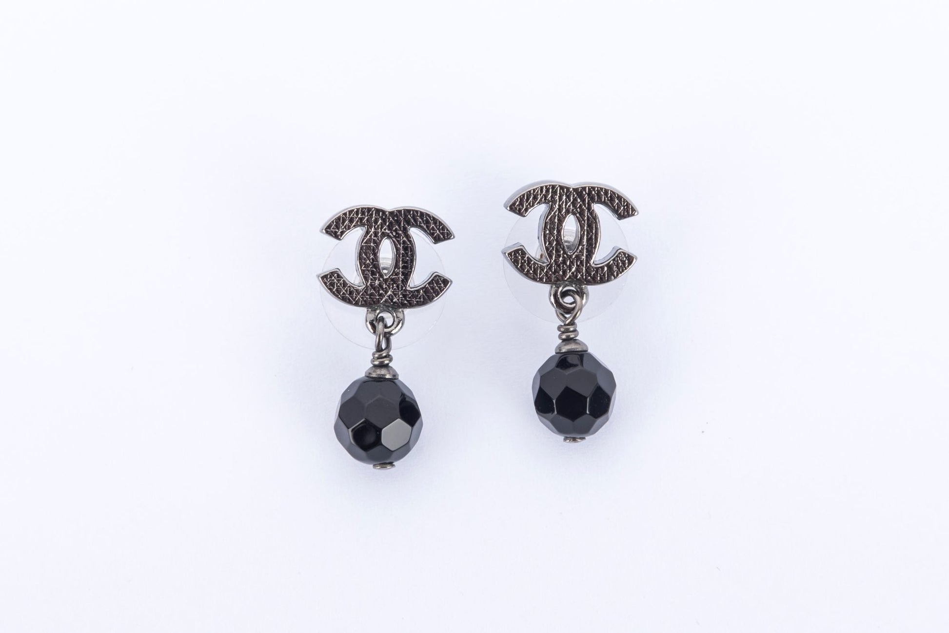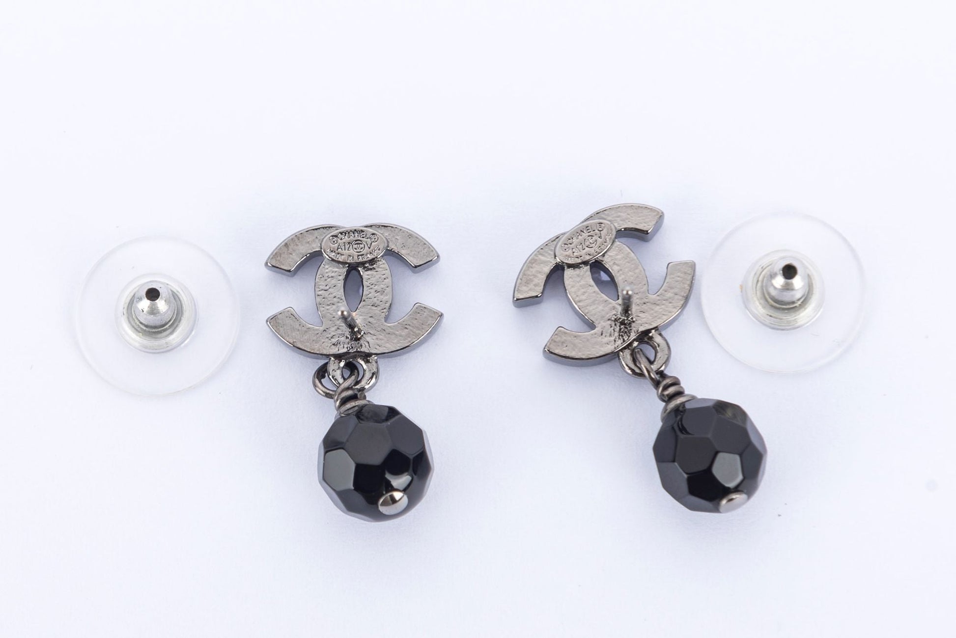 Exhibiting Chanel's rich craftsmanship and timeless design aesthetics, these earrings are meant to be flaunted. Crafted using ruthenium metal, they feature the CC logo and a black bead. The clip-on backs secure the beautiful Chanel CC earrings. The earring is in good condition, does not comes with dustcover or box.
