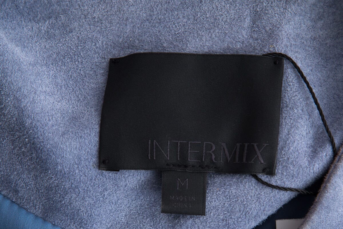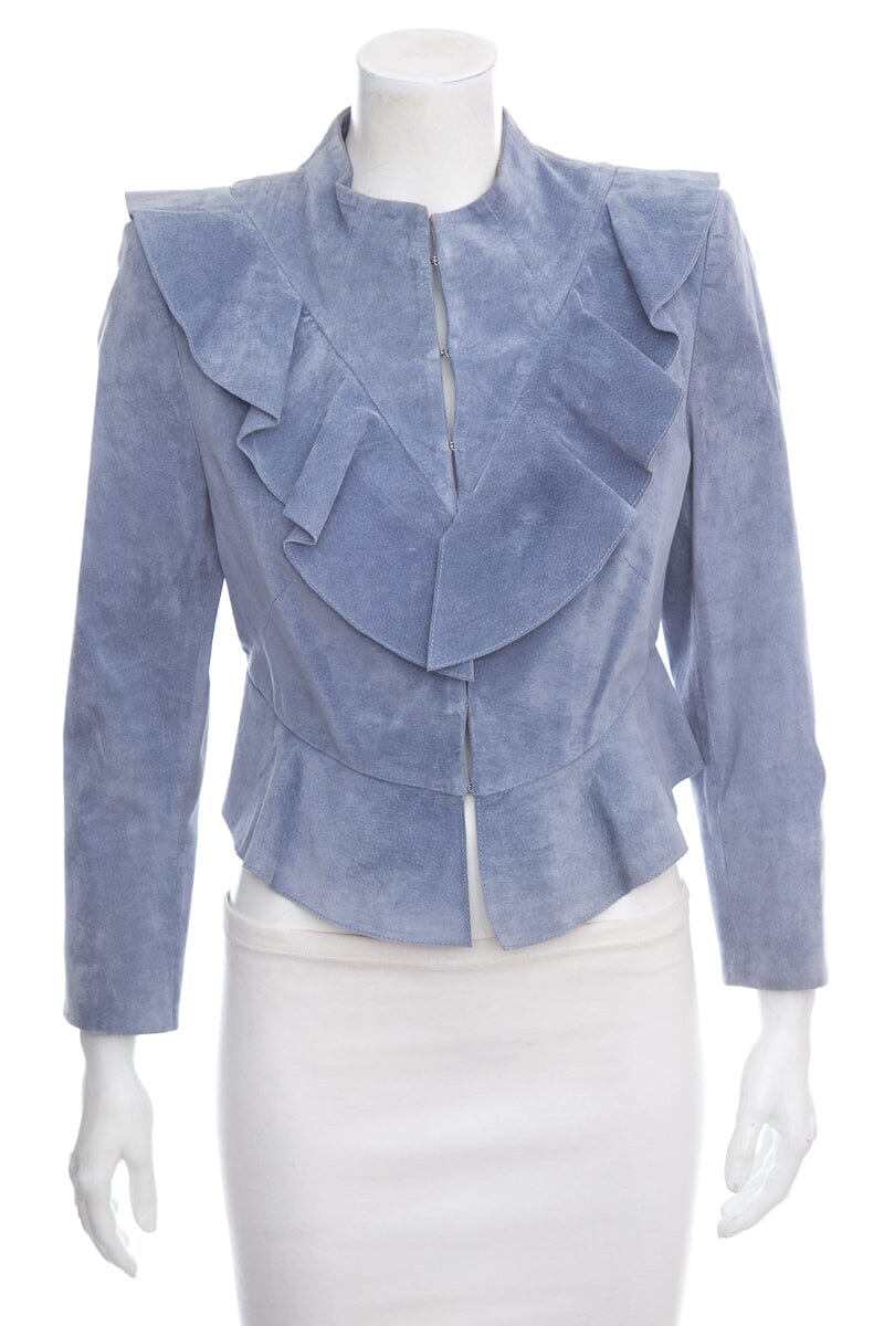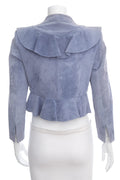 Intermix Blue Leather Suede Jacket with Front Ruffle Detail. This item is in very good condition.