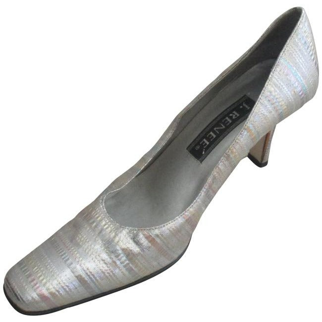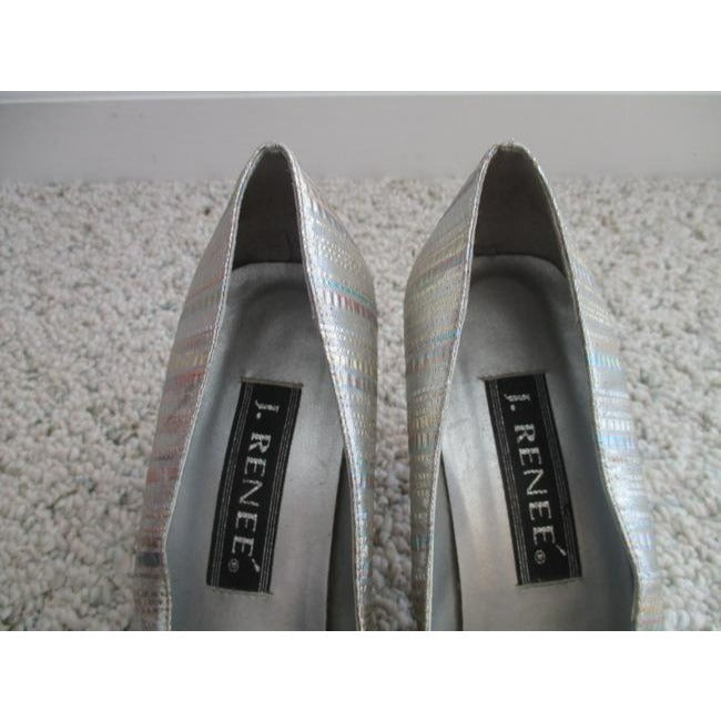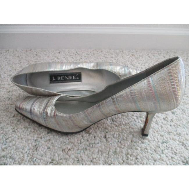 Stunning! J. Renee Vintage Silver Metallic Fabric with Subtle Blue, Pink and Gold Striped Square Toe Pumps. Signature padded insoles. All measurements are approximate. 0321jr