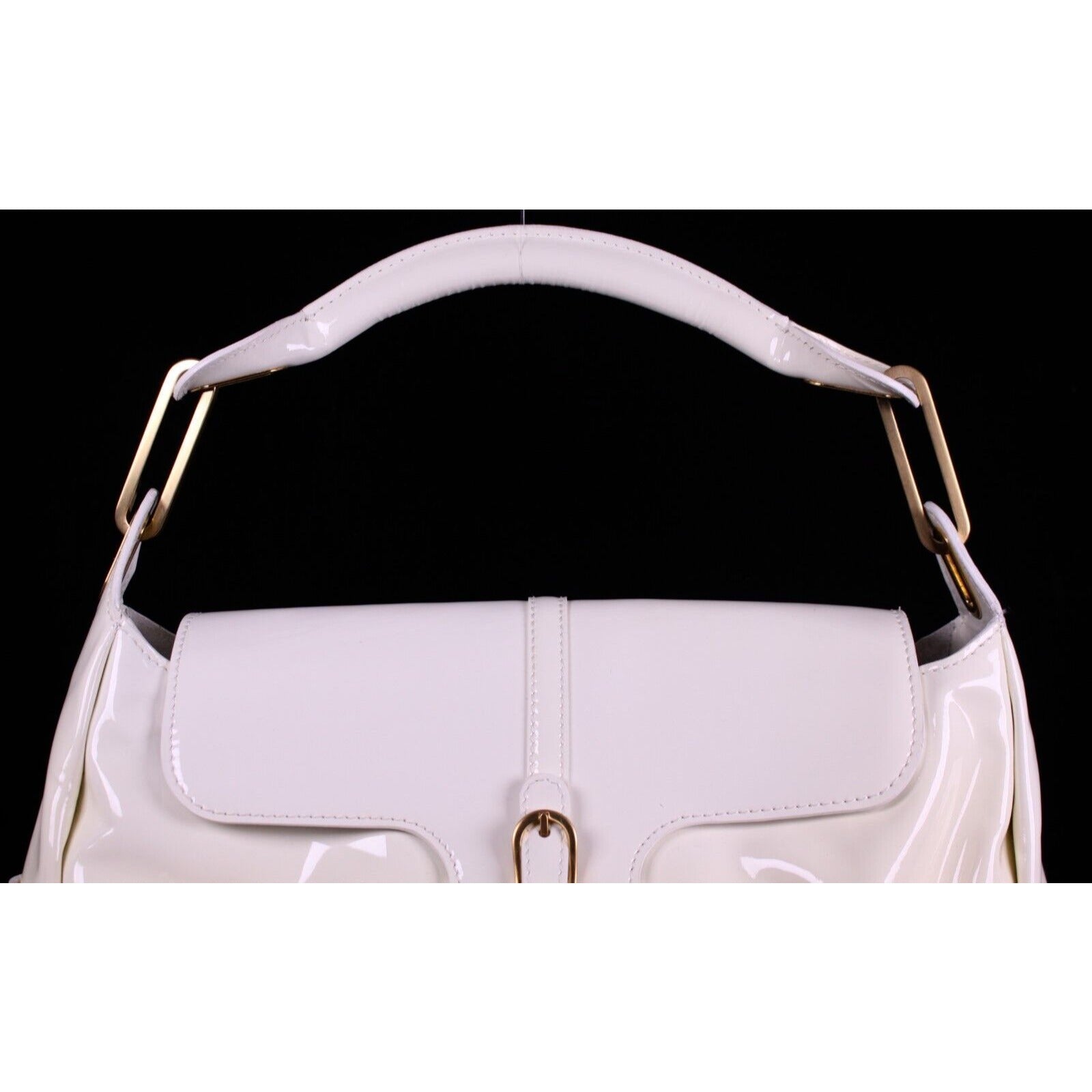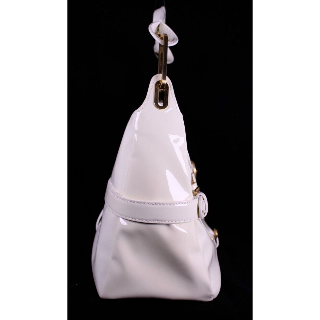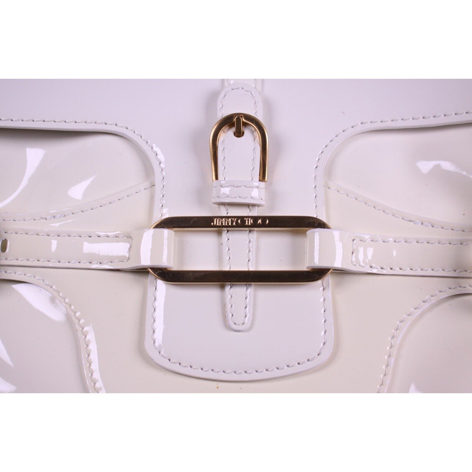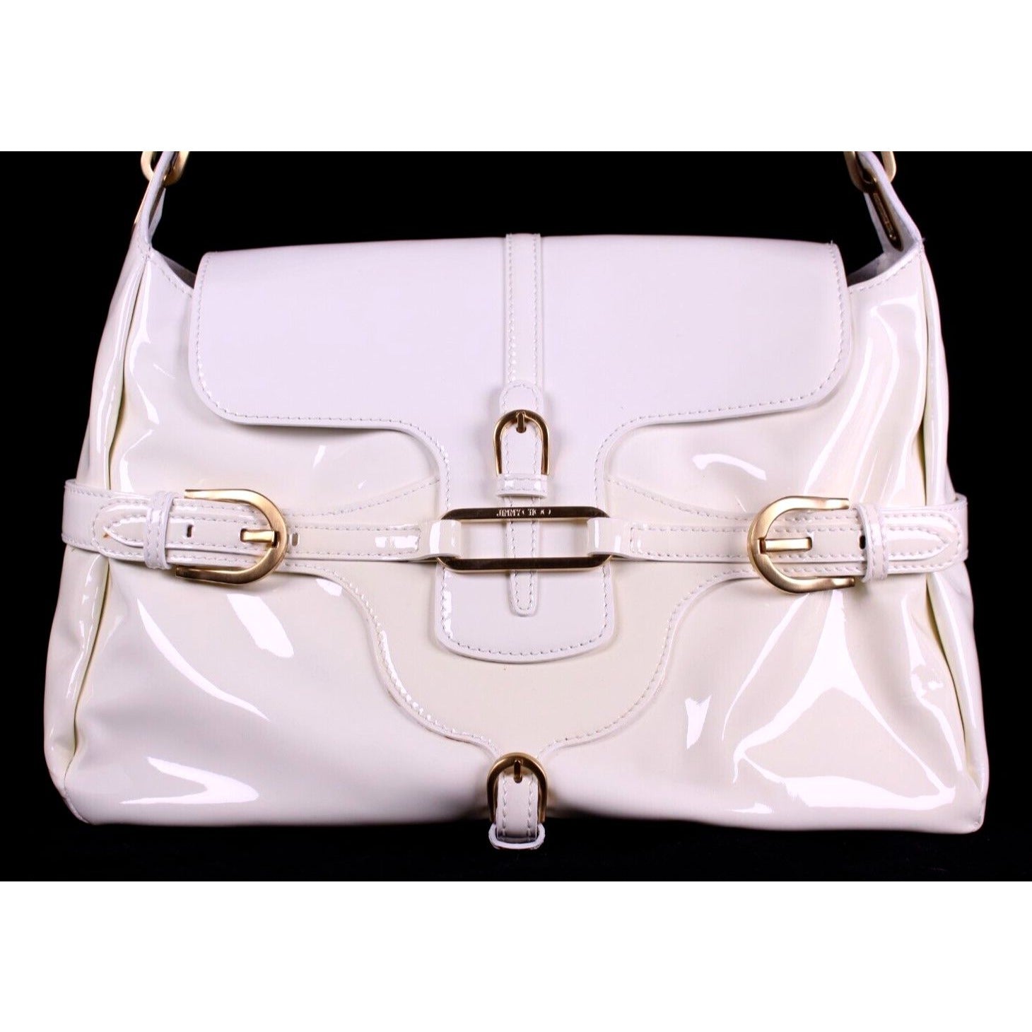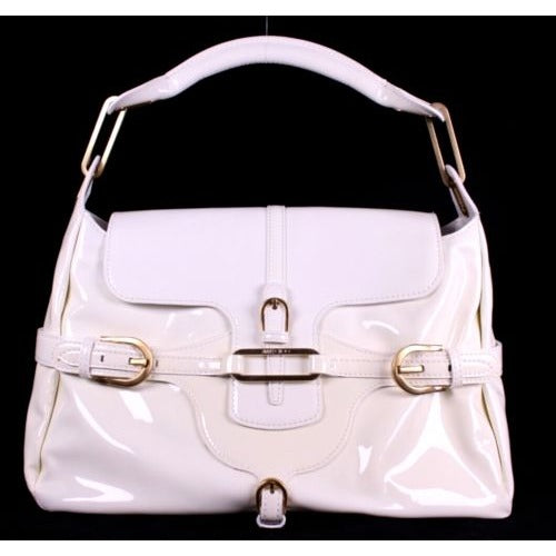 For sale is a Jimmy Choo pale yellow glossy leather shoulder bag with gold hardware & belted sides.