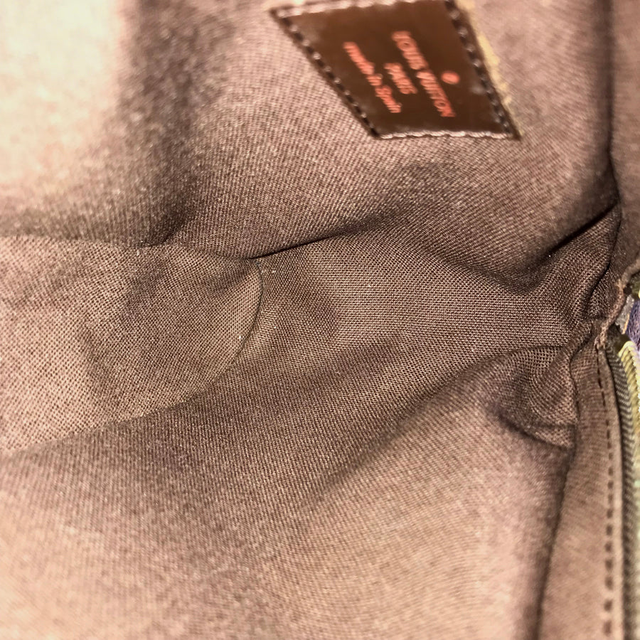 There are scrub scratches, light stains, and edge scrub on the leather of the logo.