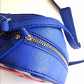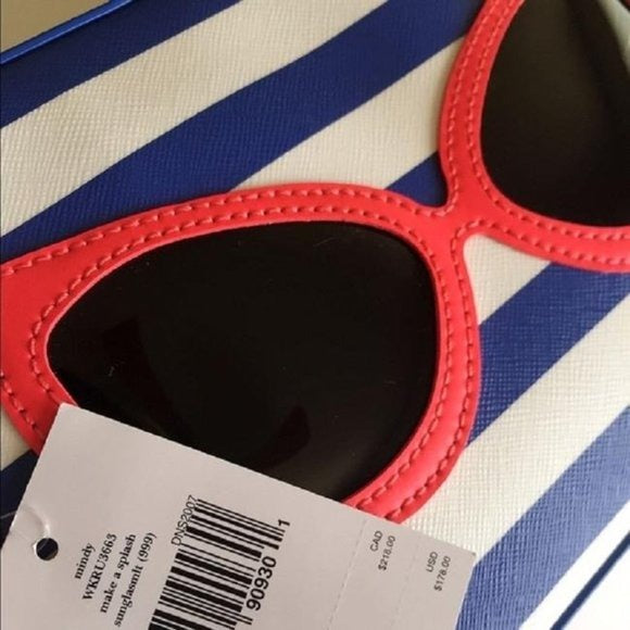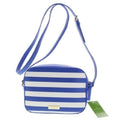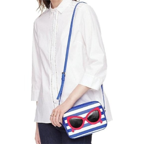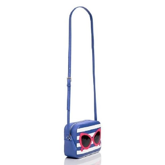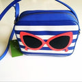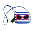 For sale is a Kate Spade, limited edition, 'Mindy' style 'Make a Splash', rectangular, shoulder or cross body purse made with blue and white striped saffiano textured grainy vinyl with matching trim and hot pink cat's eye sunglasses, a top zip closure, and 14-karat light gold plated hardware accents!