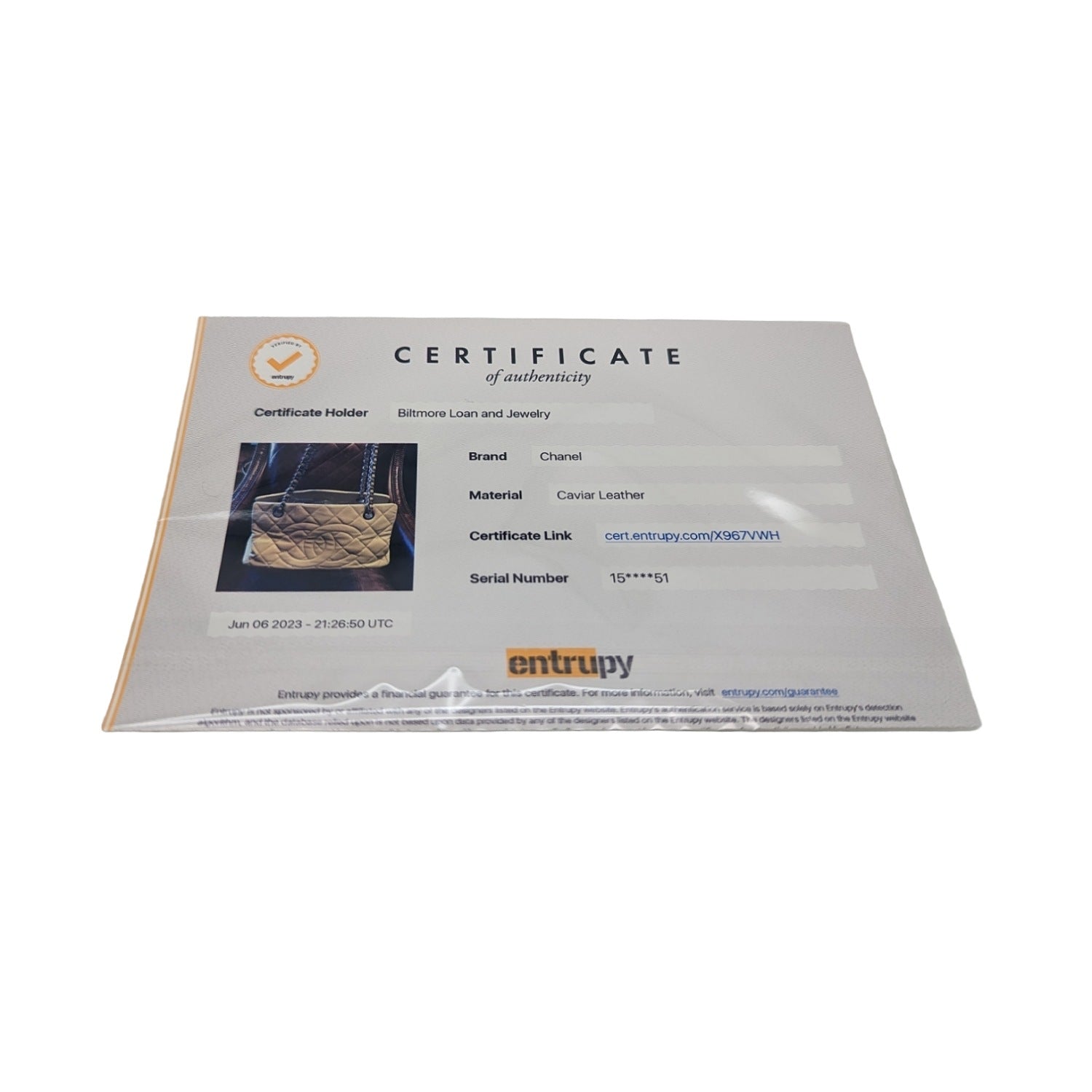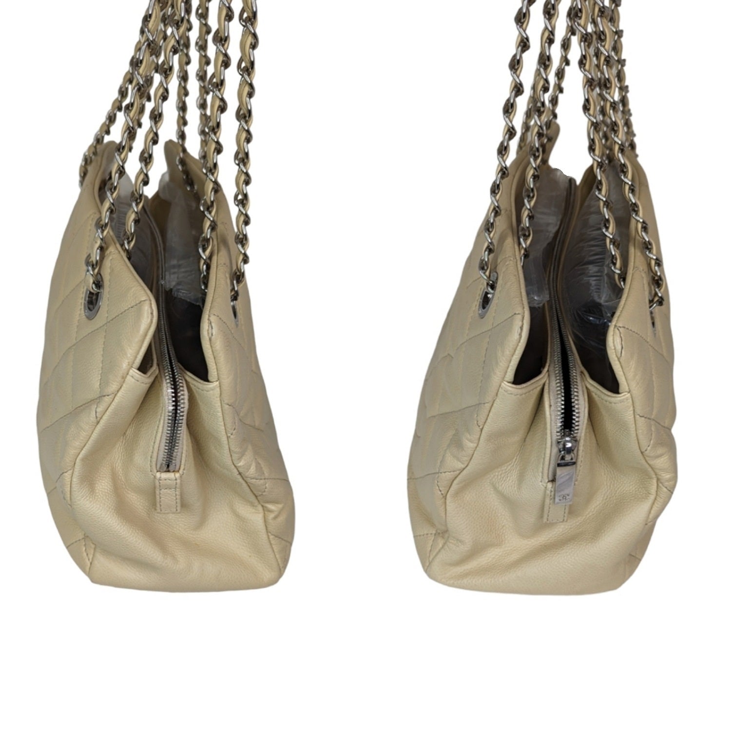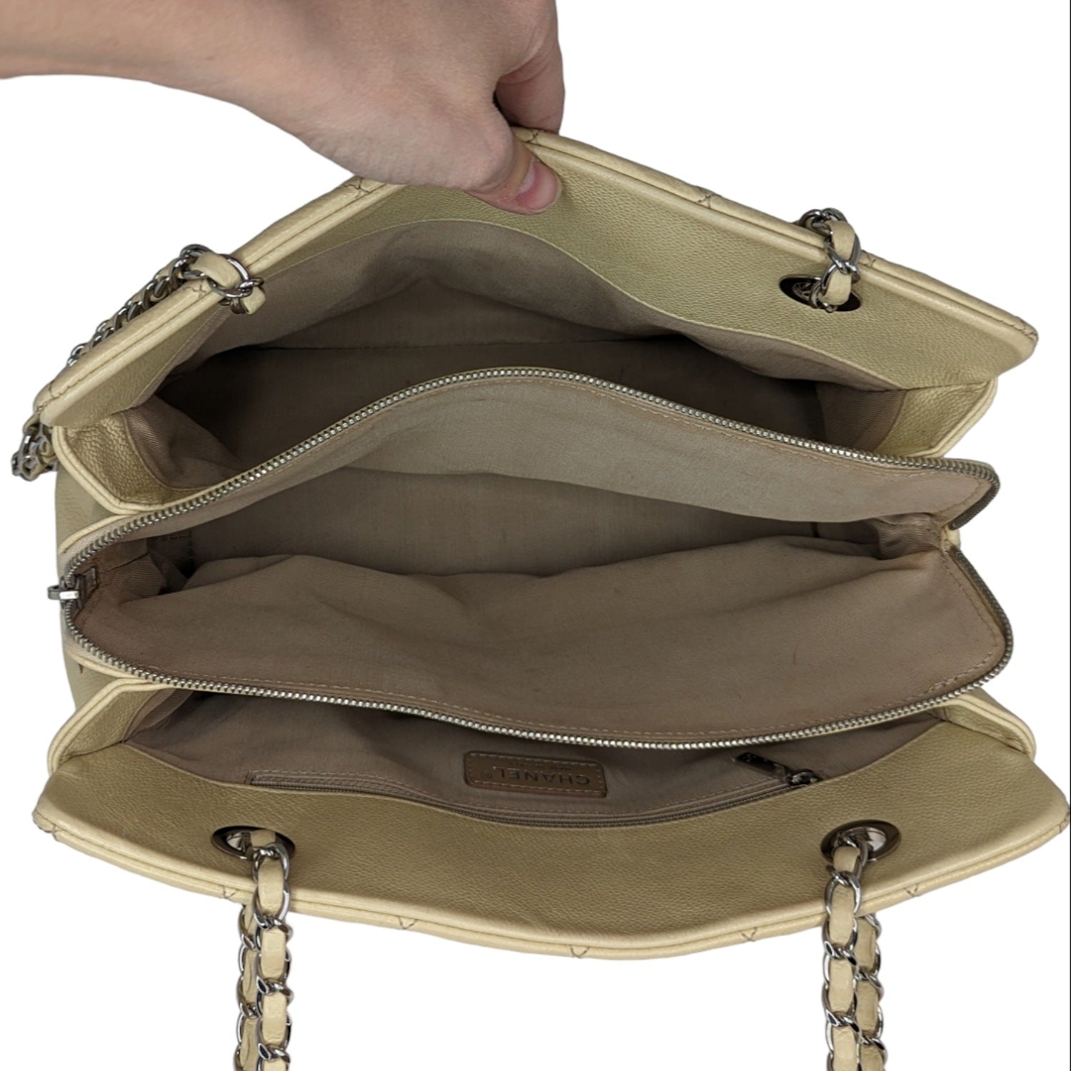 This Chanel Timeless Classic Caviar Quilted Tote is crafted from light beige quilted caviar leather. It features leather woven chain straps with leather shoulder pads, protective base studs, and silver-toned hardware. The interior is a camel-colored textile with one zippered pocket and 2 patch pockets. Retail price is $2750.