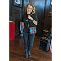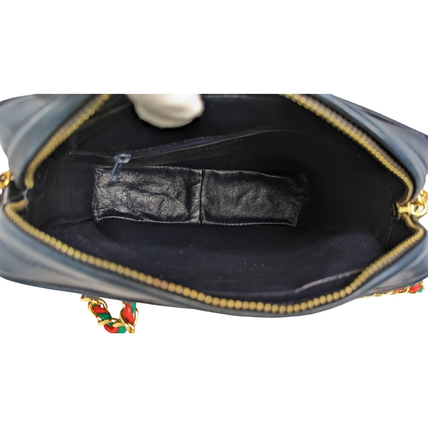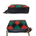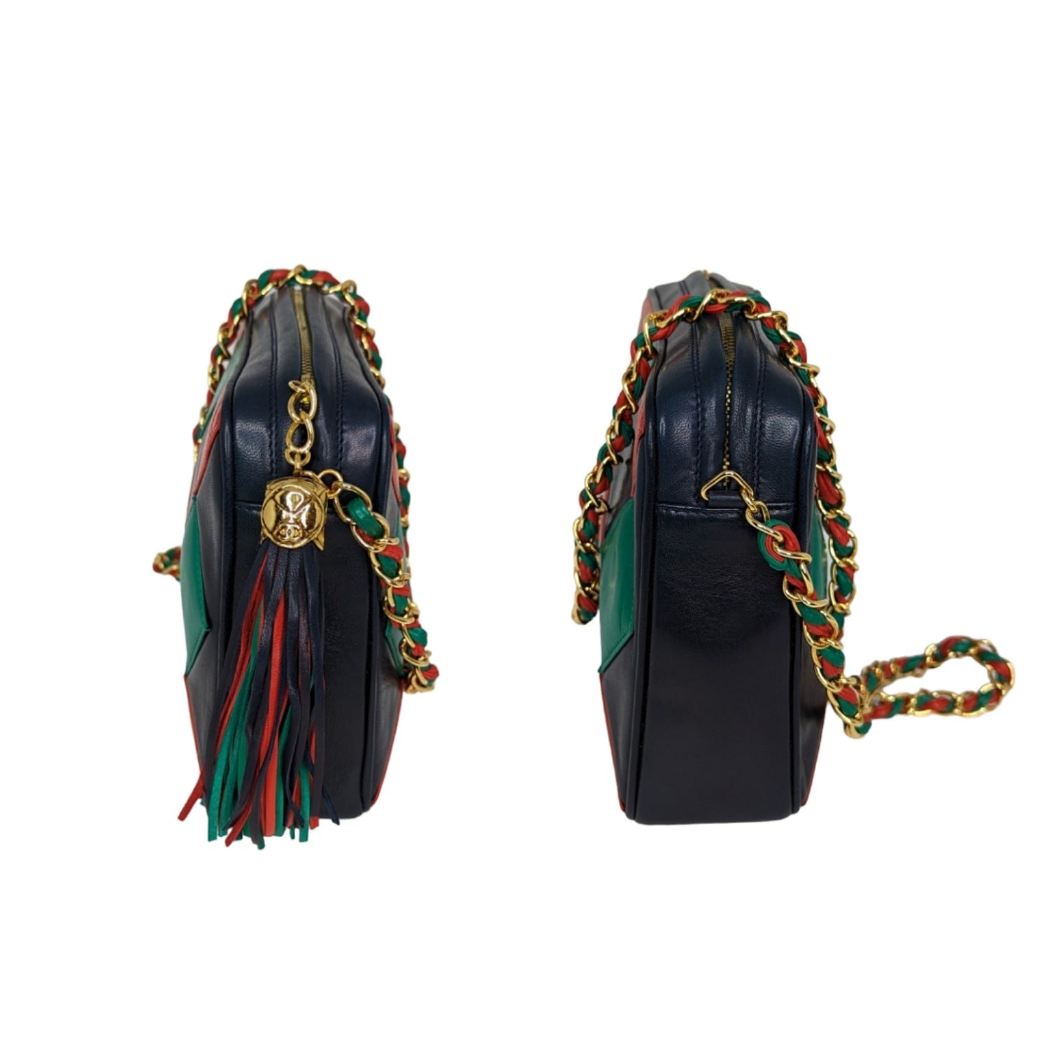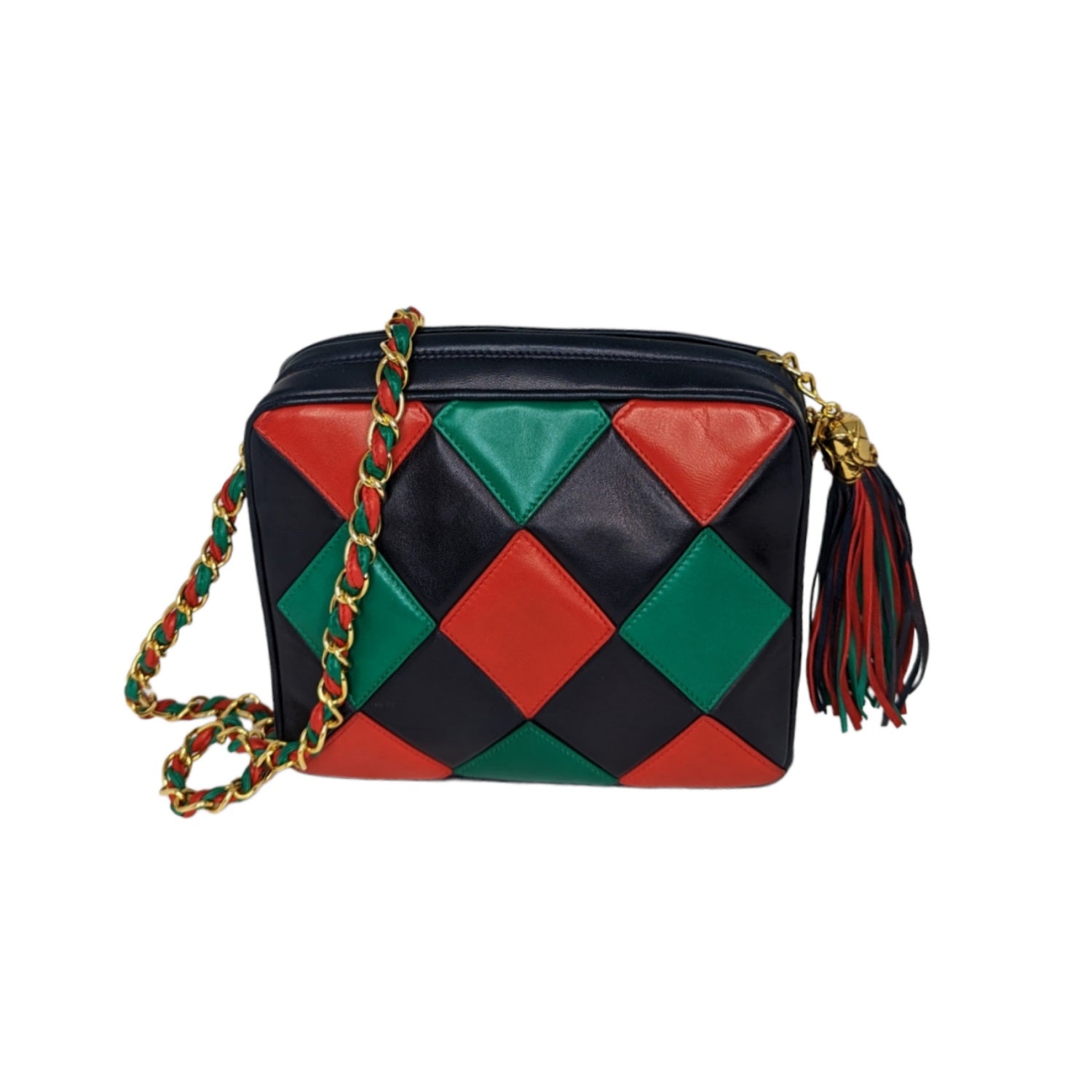 This navy-blue bag is crafted of supple lambskin leather with red and green diamond shapes with a tassel featuring a decorative quilted CC logo gold tone end cap. A red and green leather threaded chain link shoulder strap can be on the shoulder, as a shorter crossbody style or knotted together for a chic handheld style. Tonal leather lining with a single interior zip pocket.