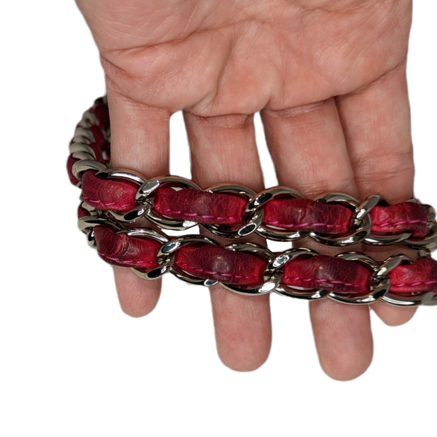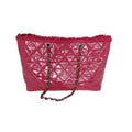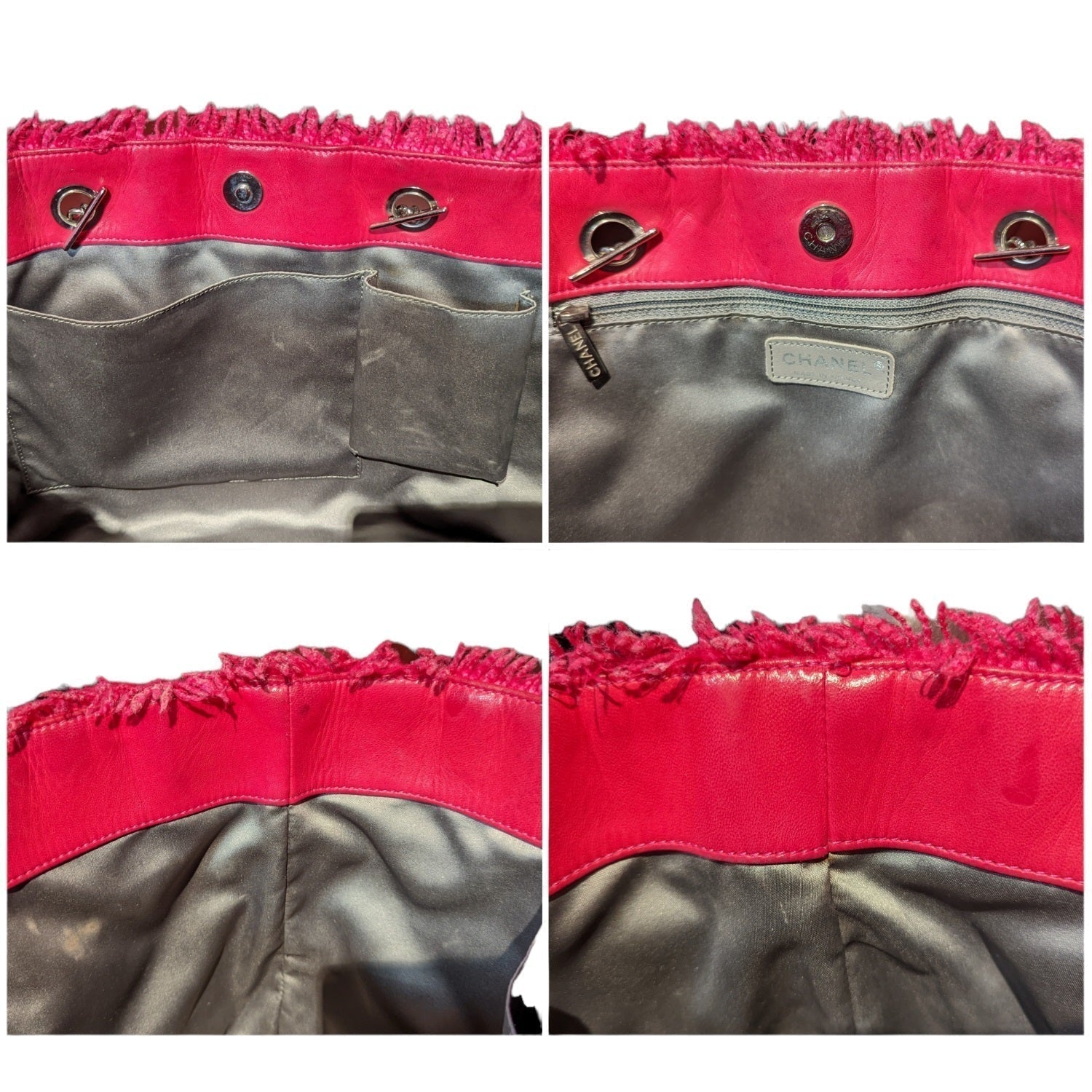 From the Pre-Fall 2009 Collection by Karl Lagerfeld. This chic tote is crafted of pink tweed with frayed edges layered with clear diamond quilted vinyl. There is a large embroidered Bags lucia CC, and silver chain shoulder straps threaded with pink leather. The top is open to a satin interior with zippered and patch pockets.