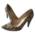 Classic brown/beige snakeskin pumps 'Made in Italy' with 4 inch heels and rounded pointed toe. Padded signature neutral insoles. All measurements are approximate.