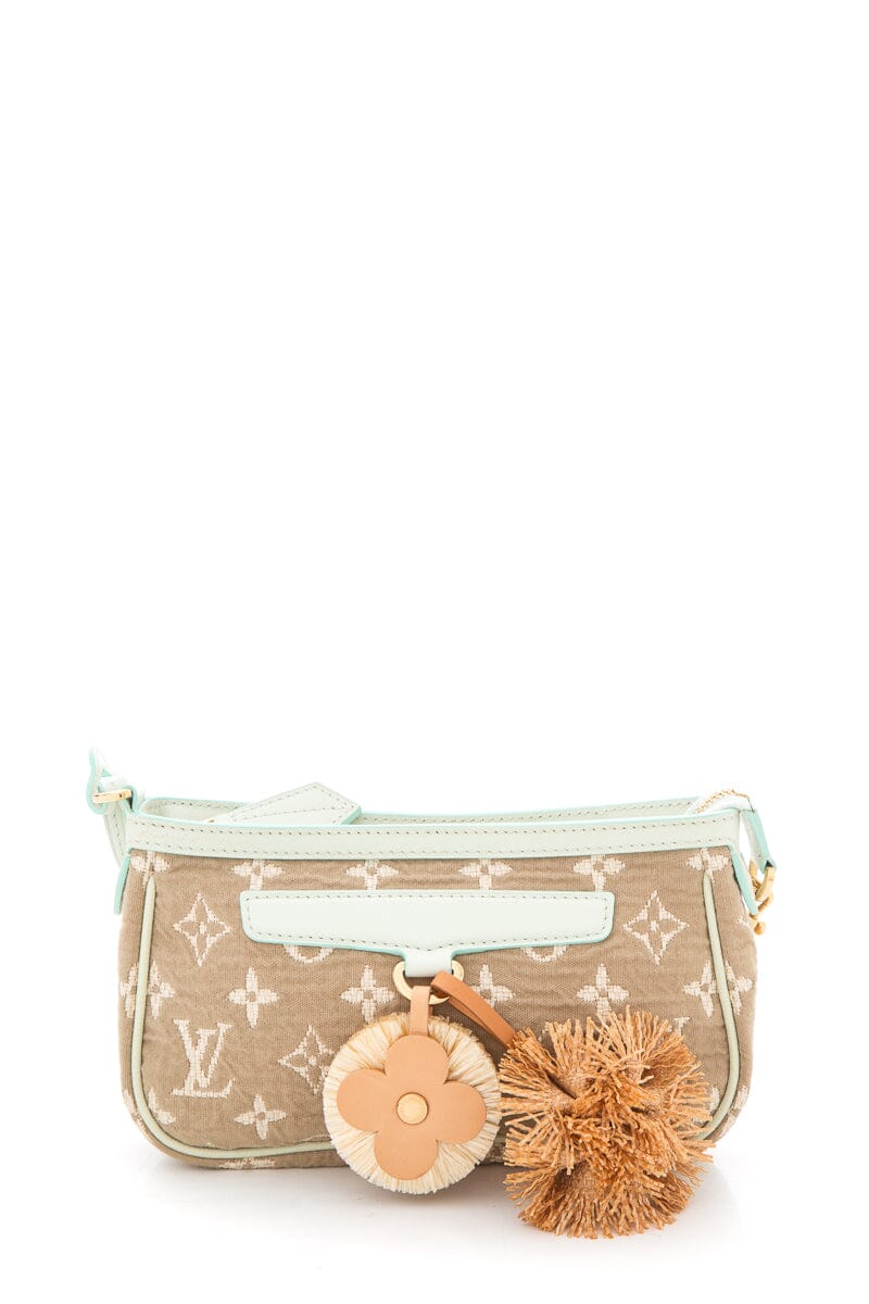 Louis Vuitton 2010 Blue & Beige Monogram Pochette with Raffia Charm. This item is in very good condition.