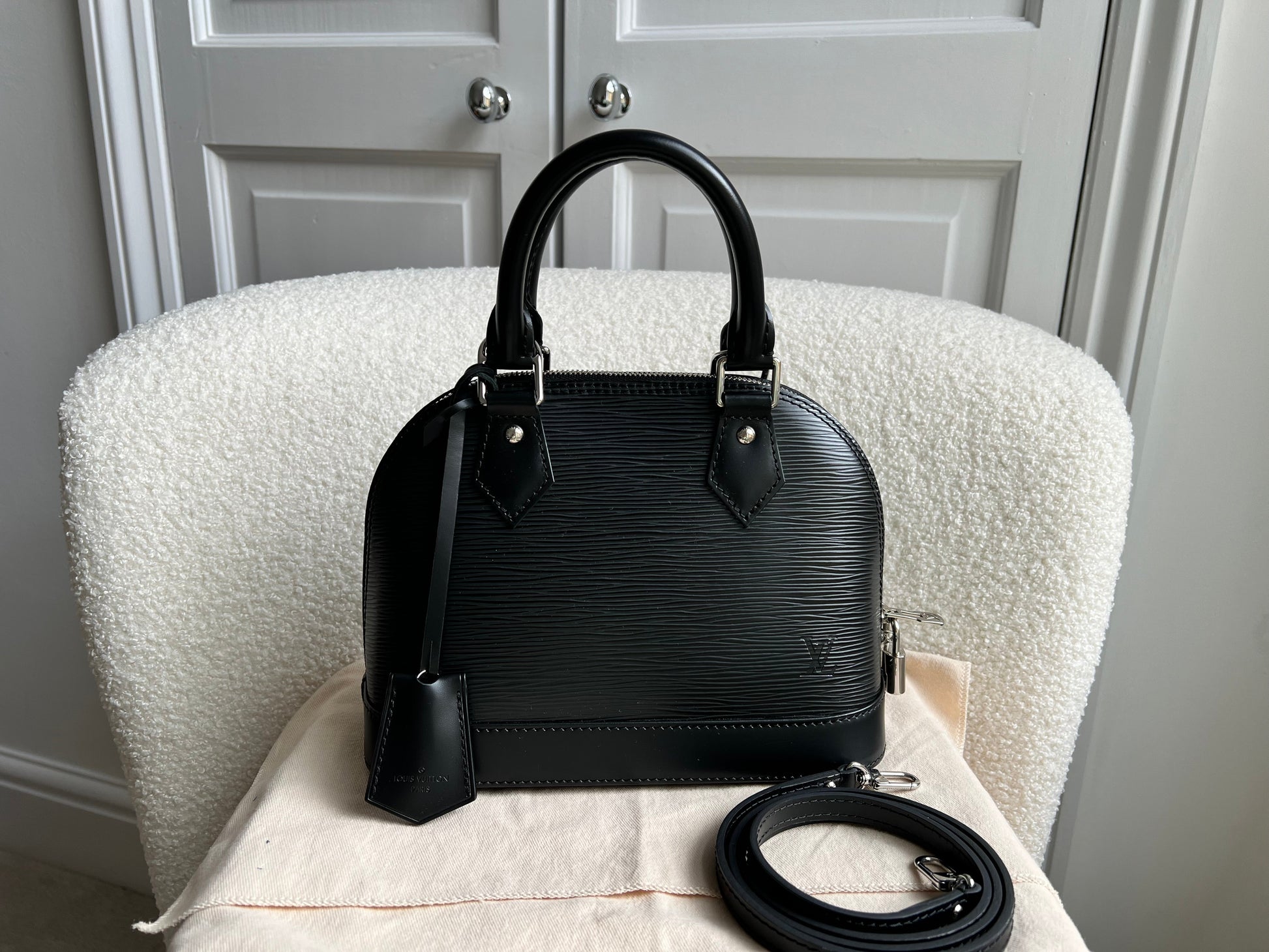 Louis Vuitton Alma BB Bag in Black Epi leather with silver hardware. This style is timeless and elegant and remains one of Louis Vuitton's most popular styles. This highly sought after style features padlock and keys contained within leather, twin handles and removable leather strap. Perfect size for those who prefer smaller Bags for day use, the Alma BB can be carried in hand or carried over shoulder or cross body. Perfect Accessory for day to night wear.