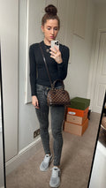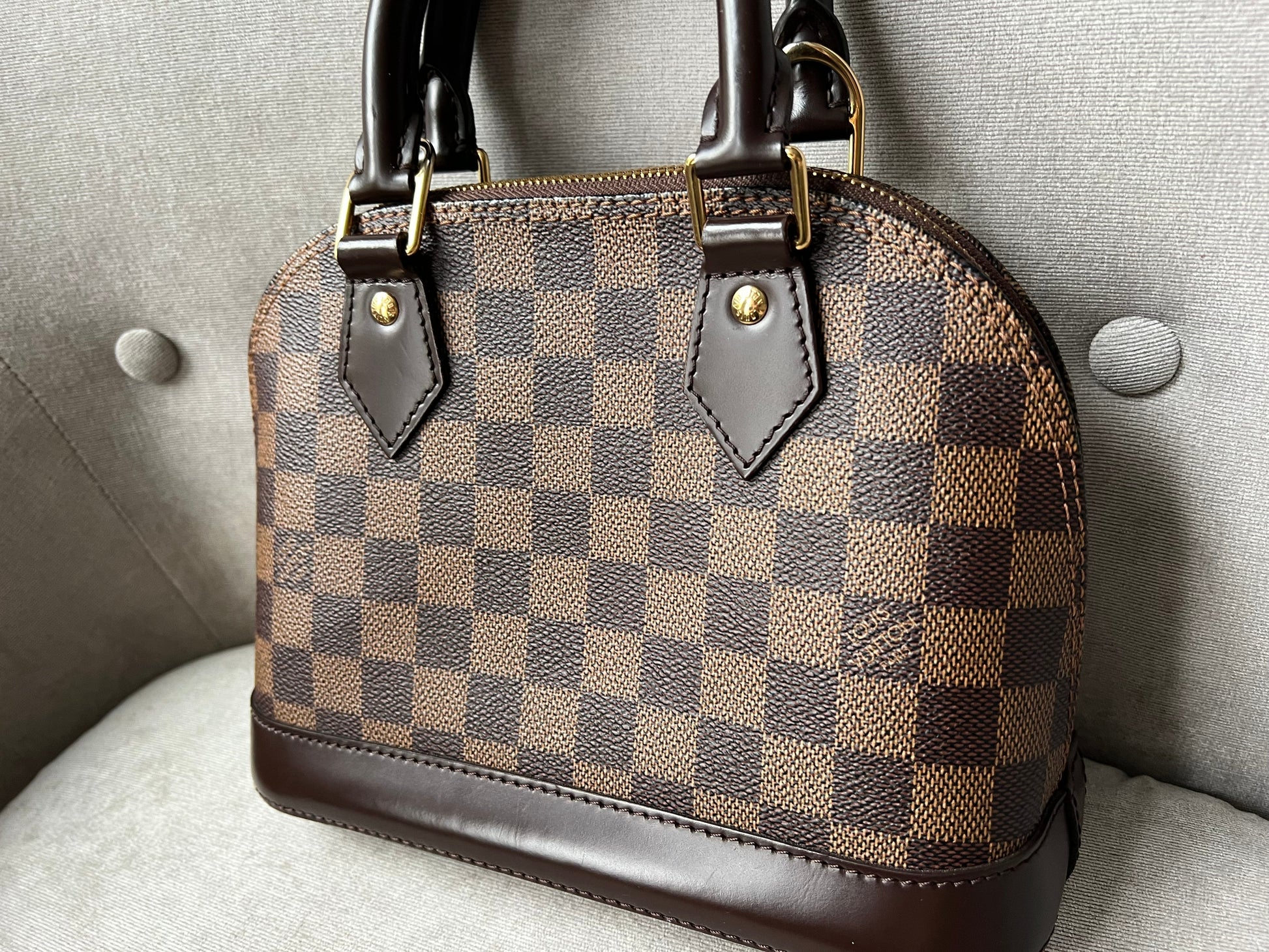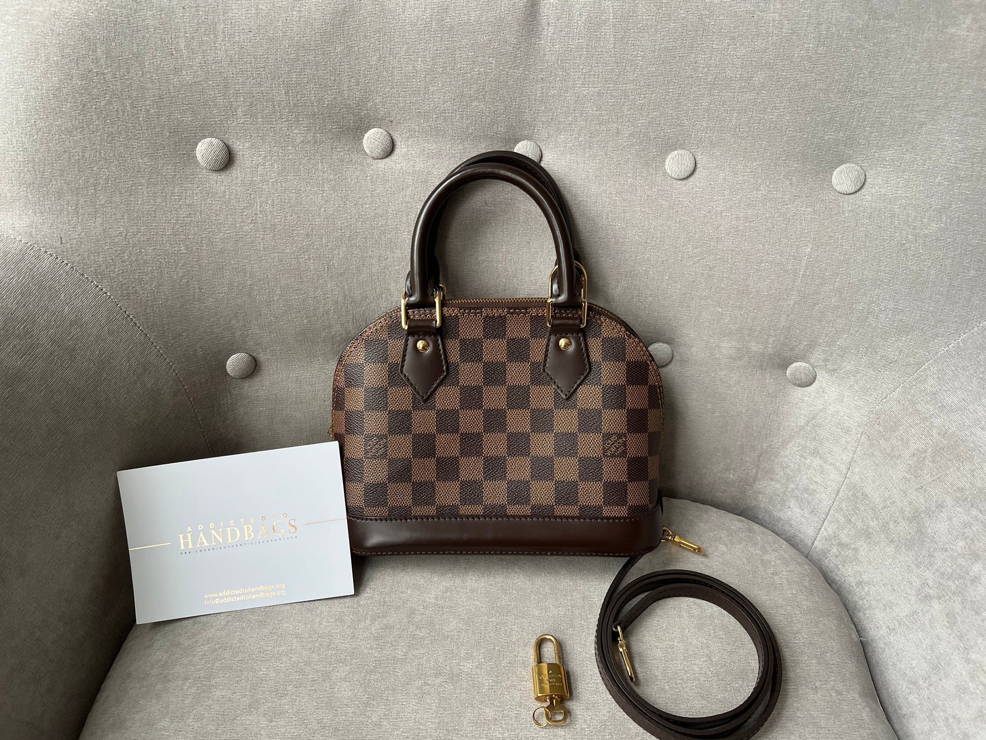Louis Vuitton Alma BB Bag in Damier Ebene canvas with gold hardware. This style is timeless and elegant and remains one of Louis Vuitton's most popular styles. Sold out at LV, this highly sought after style features padlock and keys (note the hanging fob is missing), twin handles and removable leather strap. Perfect size for those who prefer smaller Bags for day use, the Alma BB can be carried in hand or carried over shoulder or cross body. Perfect Accessory for day to night wear.