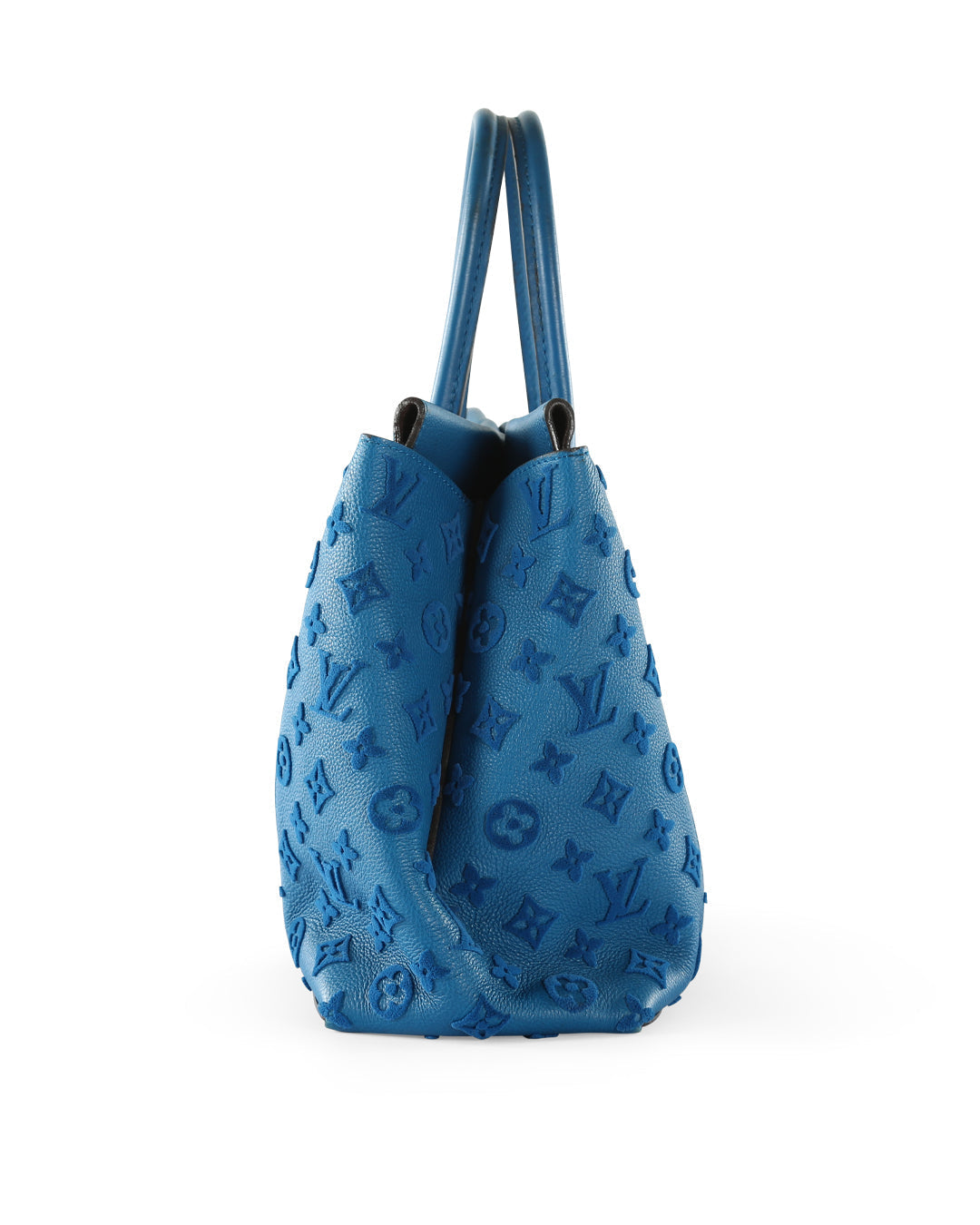 This Louis Vuitton bag is crafted from blue leather with monogram velvet at sides.