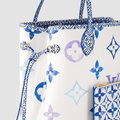 Characteristics: The Neverfull MM tote is summer-ready in cream-color canvas with a Giant Monogram pattern in pastel. The LV's and Monogram Flowers are rendered irregularly, as if in watercolor, and are perfectly complemented by the dense Monogram Blossom print on the trim along the top of the bag and on the handles and their mounts.