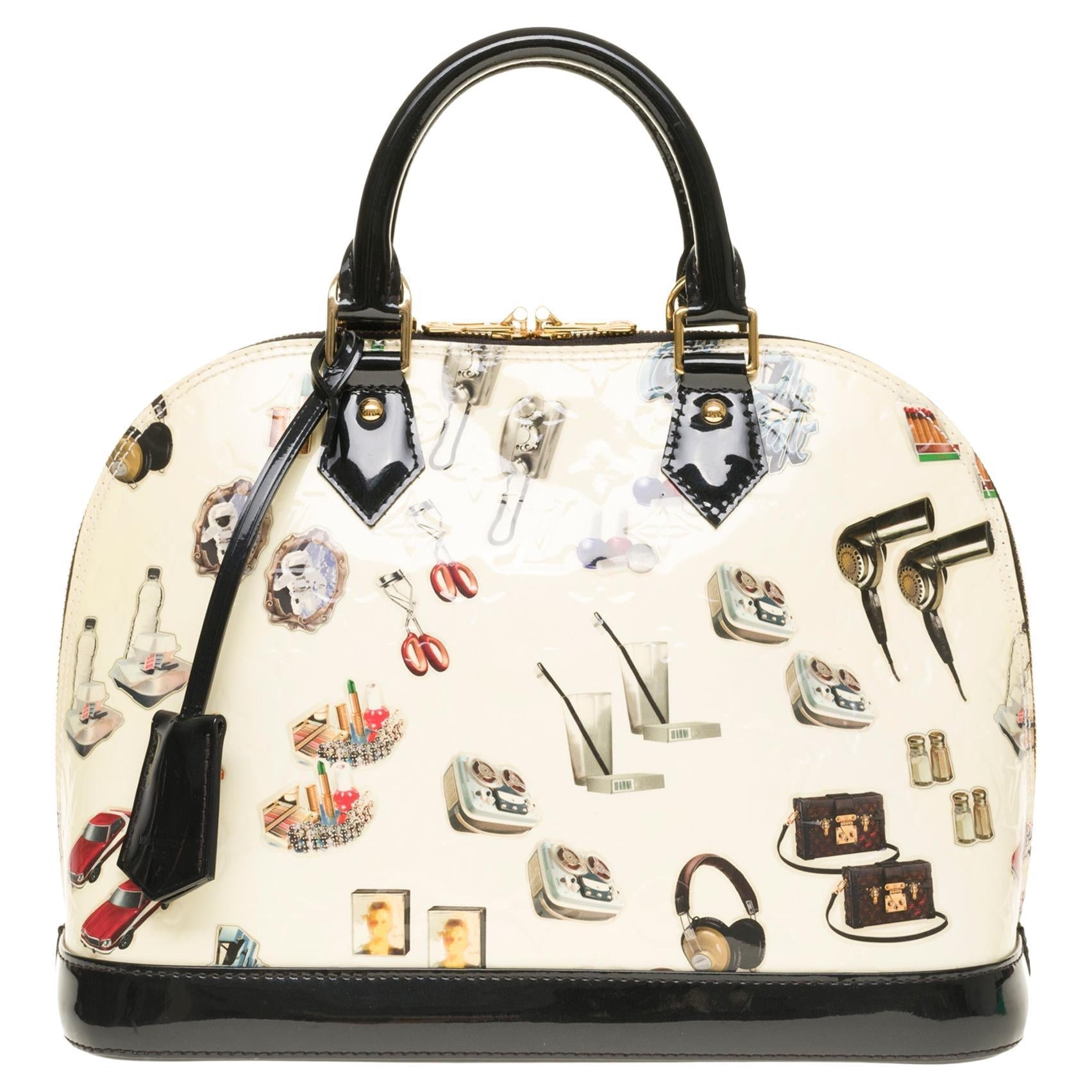 Collector's handbag of the Nicolas Ghesquiere Collection- Year 2015 Louis Vuitton Alma limited edition "Alma Sticker Animation" bag in white Monogram patent leather decorated with multiple various stickers, black patent leather handles Black canvas interior, 1 double patch pocket 4 feet LV bottom Signature: "Louis Vuitton Paris, Made in France".