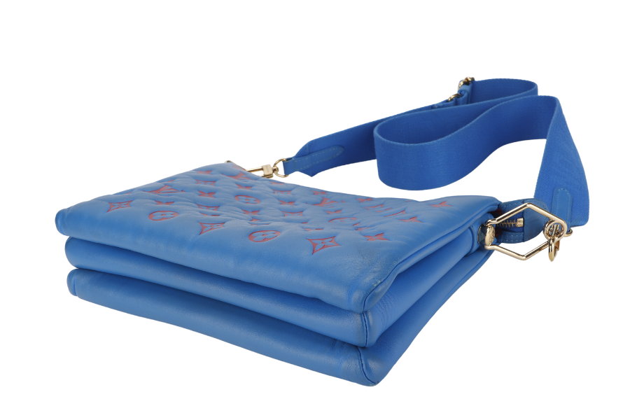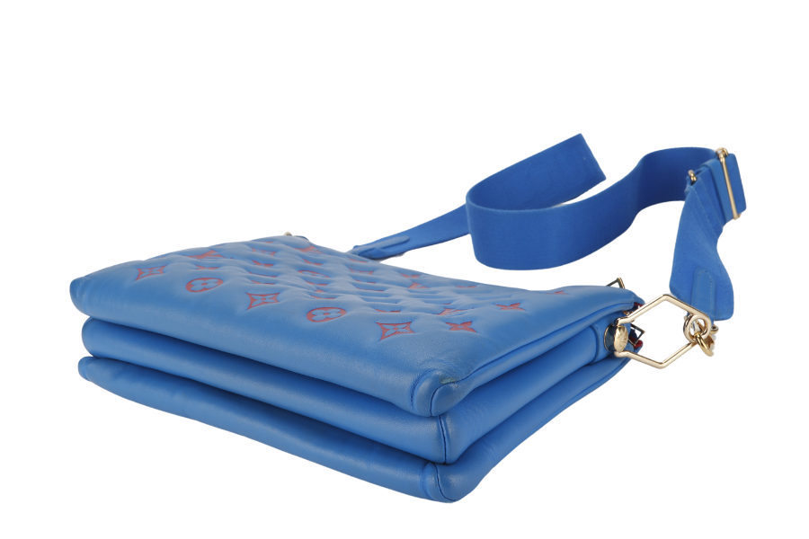 LOUIS VUITTON COUSSIN CROSSBODY BAG PM BLUE & RED EMBOSSED LAMBSKIN GOLD HARDWARE MICROCHIP WITH DUST COVER AND BOX