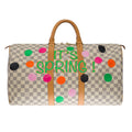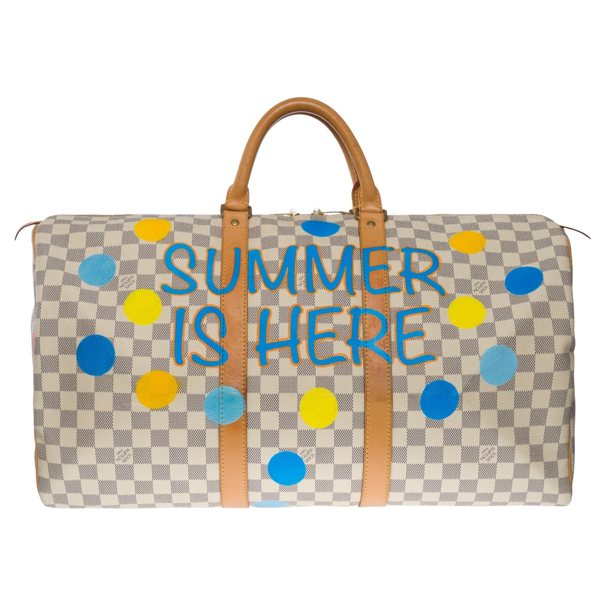 Exceptional Louis Vuitton Keepall 50 travel bag in azure checkered canvas and natural leather customized "Spring X Summer" by the artist of Street Art PatBo Gold-plated metal trim, double handle in natural leather for hand-carrying Double zip closure.