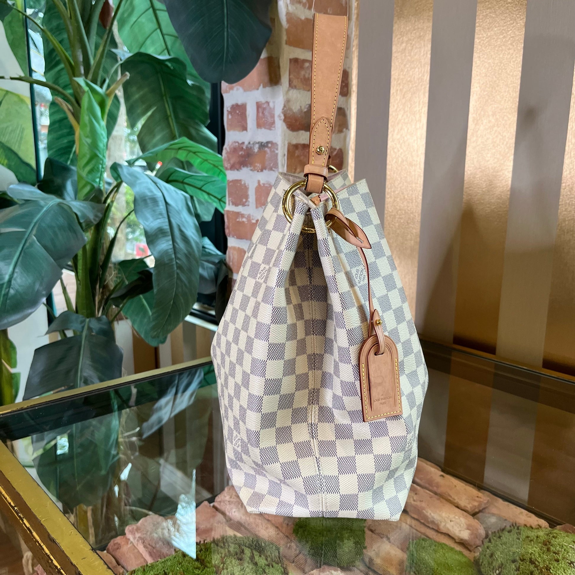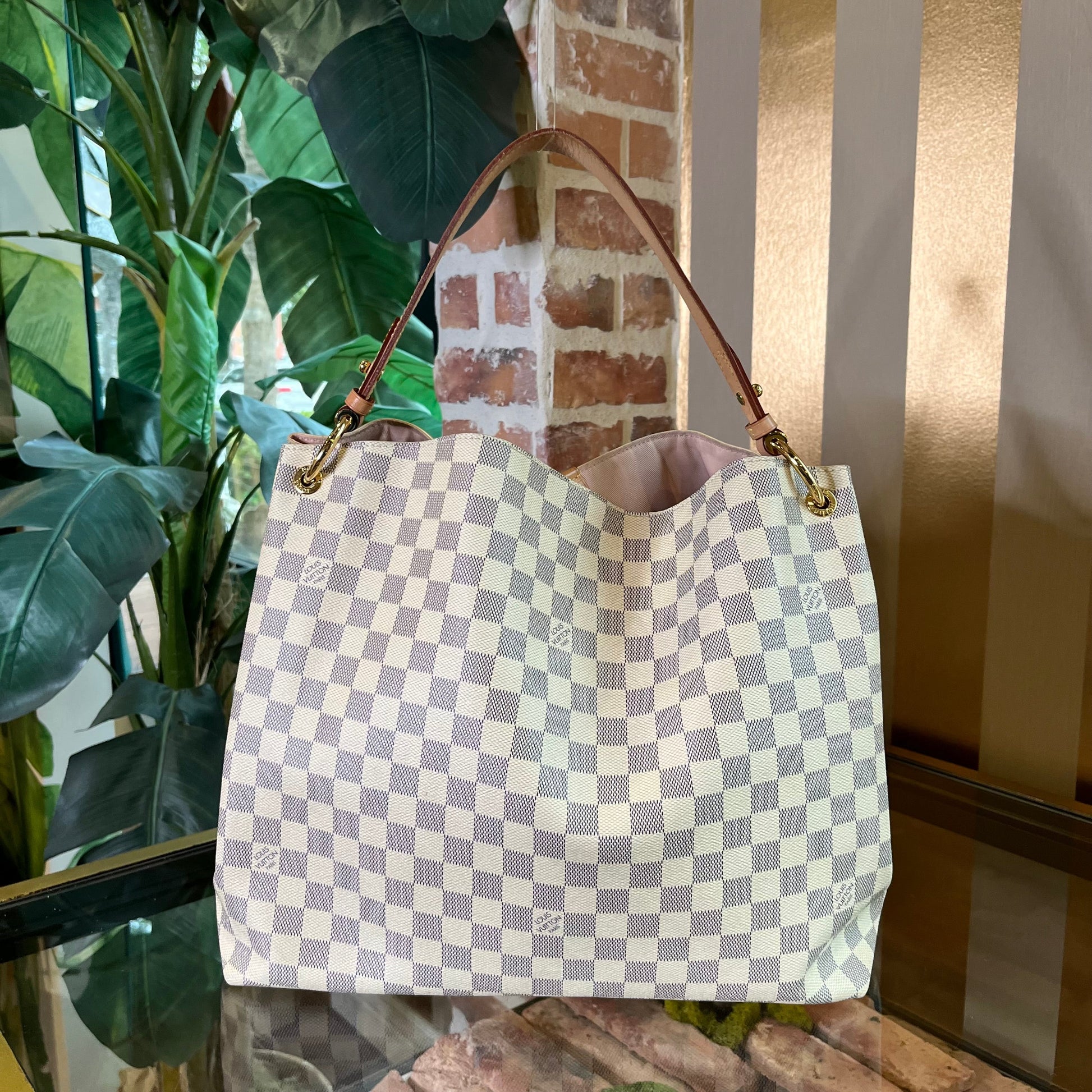 The Louis Vuitton Graceful MM in Damier Azur with Rose Ballerine Pink lining is a lightweight and elegant shoulder bag, featuring the iconic checkered canvas, natural leather trims, a comfortable strap, and a spacious interior with a soft pink lining for a feminine touch. Good Overall Condition.