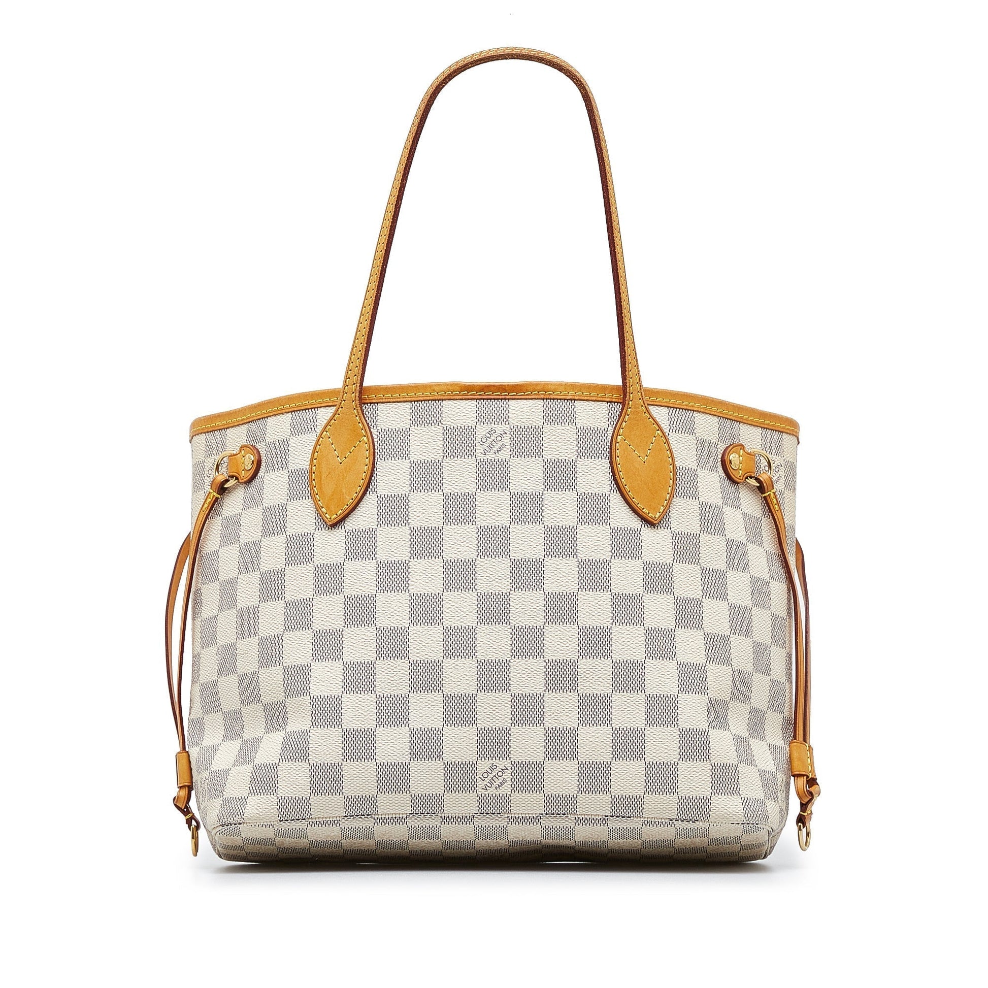 The Neverfull PM features a damier canvas body with a leather trim, flat shoulder straps, an open top, and an interior zip pocket.