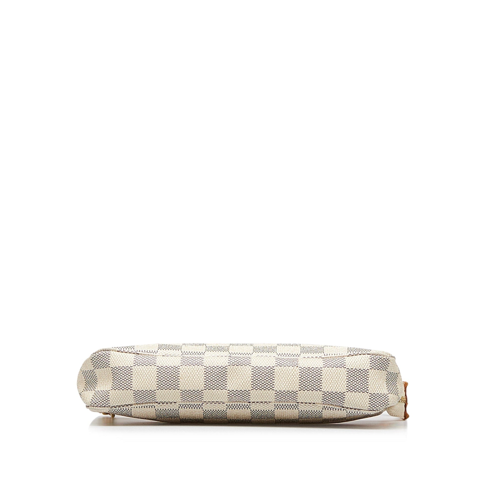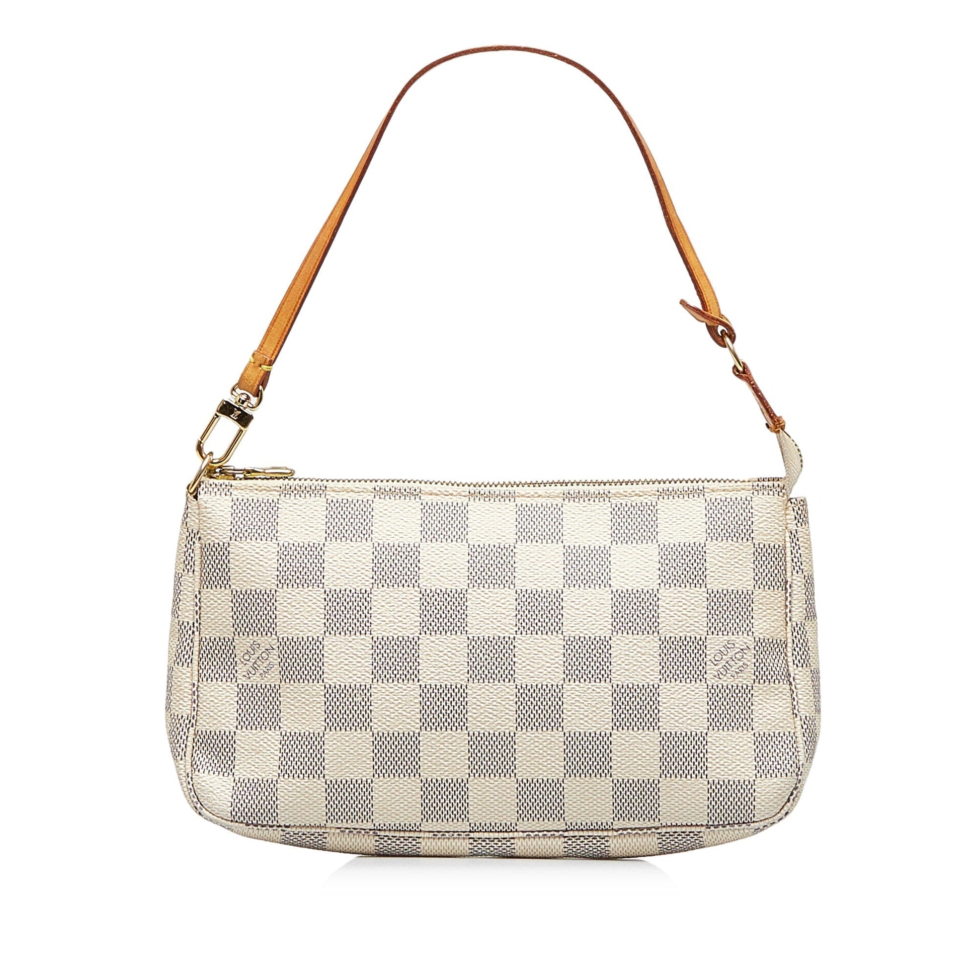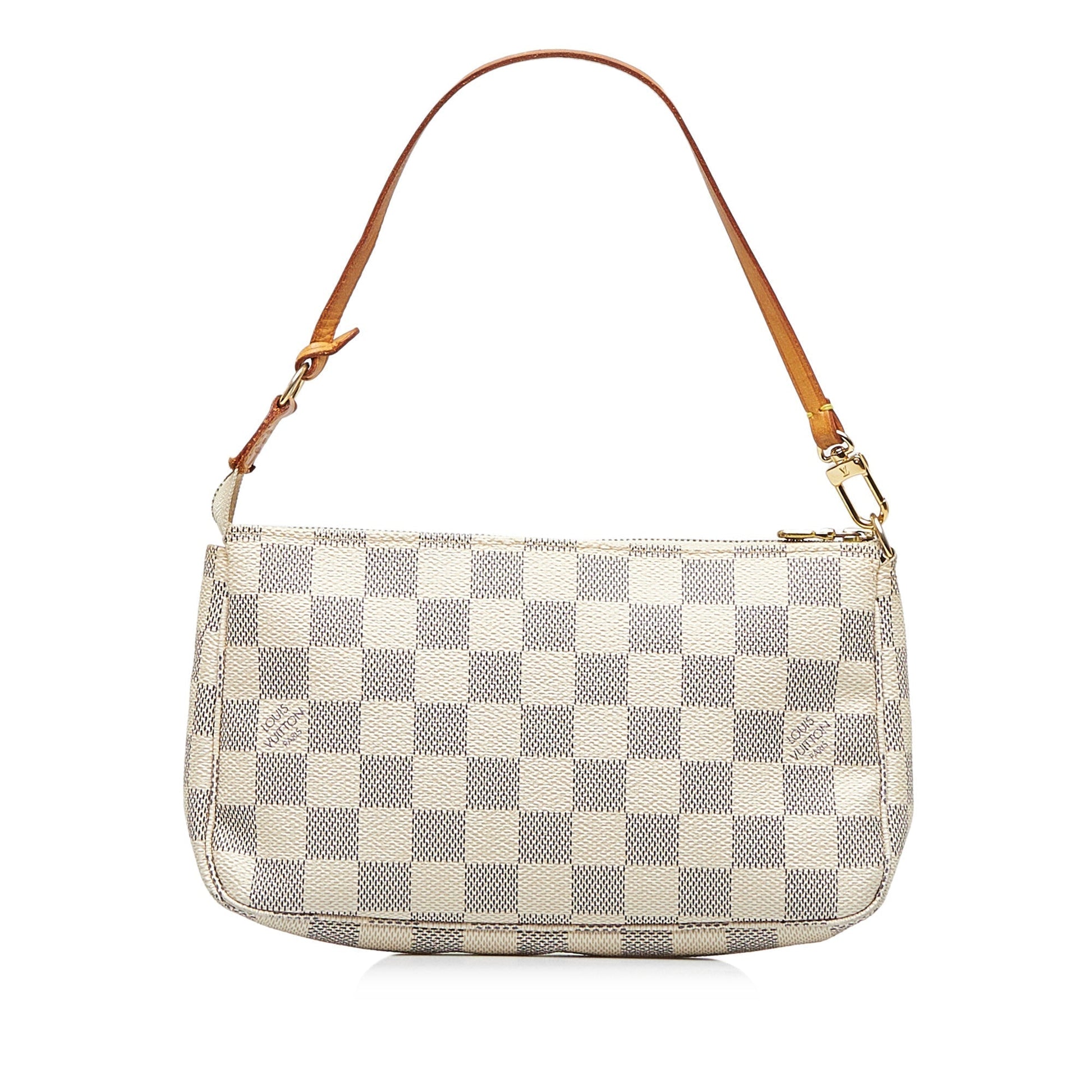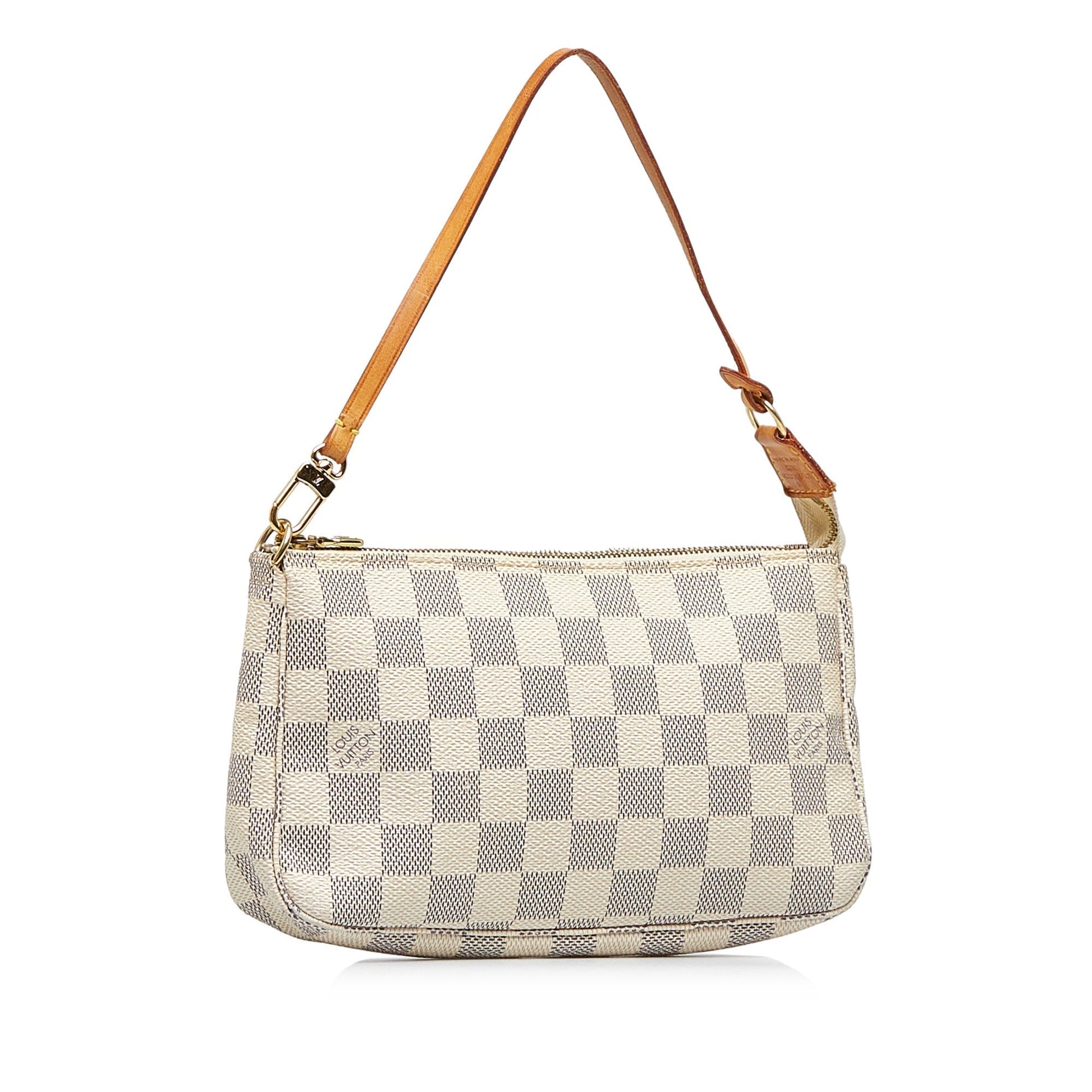 The Pochette Accessoires features a damier canvas body, a flat leather handle, and a top zip closure.