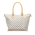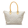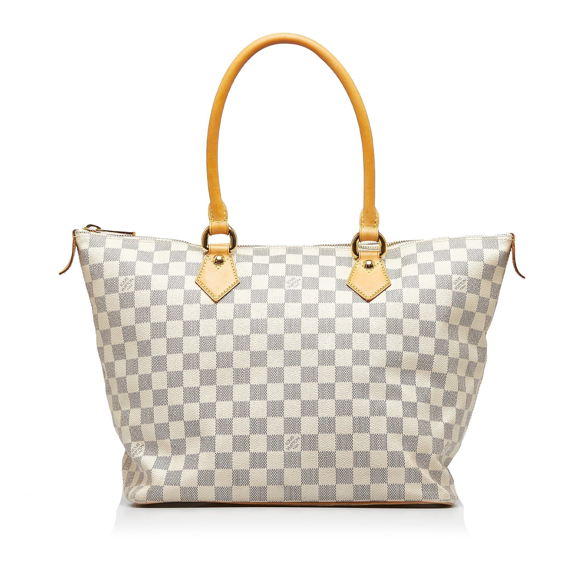 The Saleya PM features a damier azur canvas body, rolled leather straps, top zip closure, and interior slip pockets.