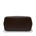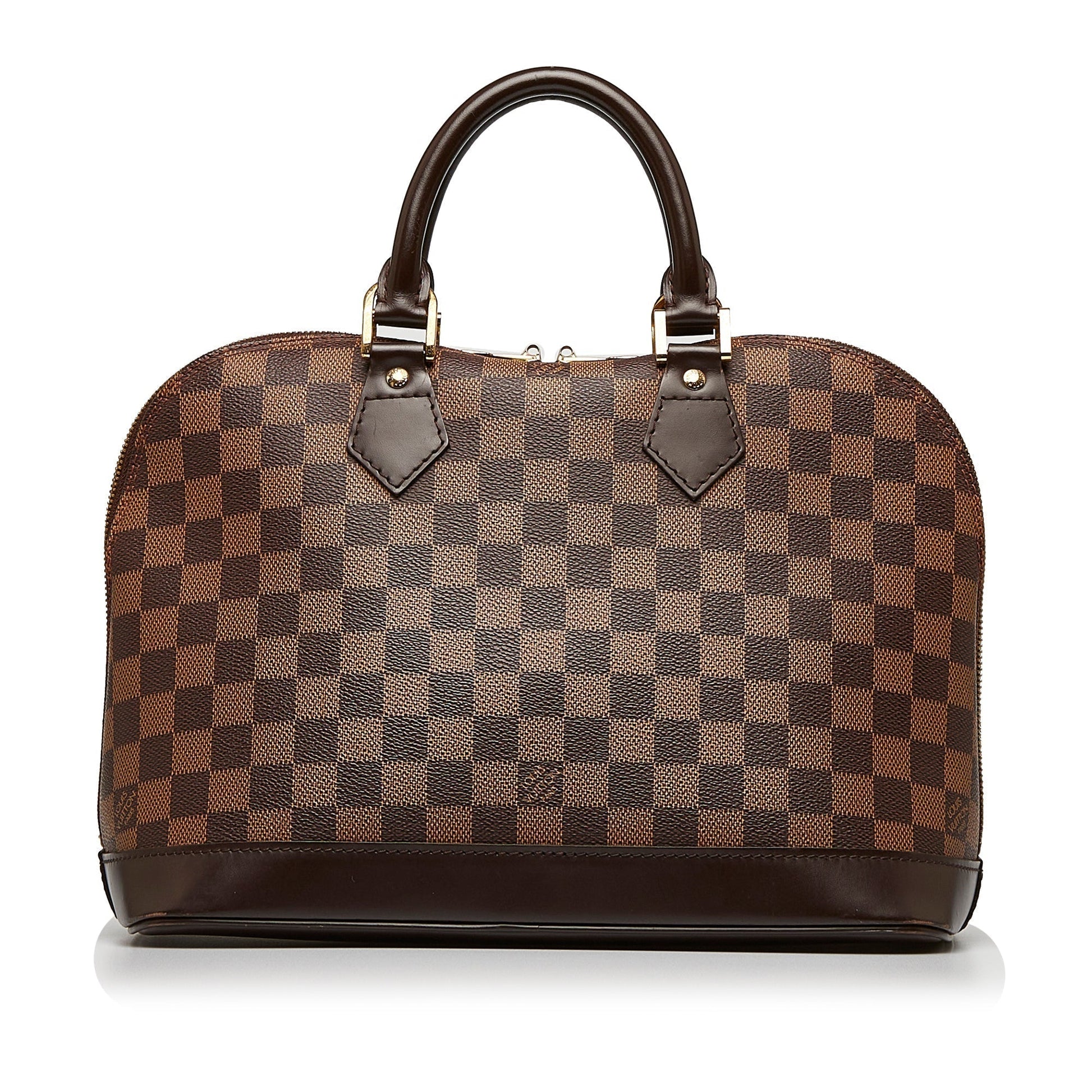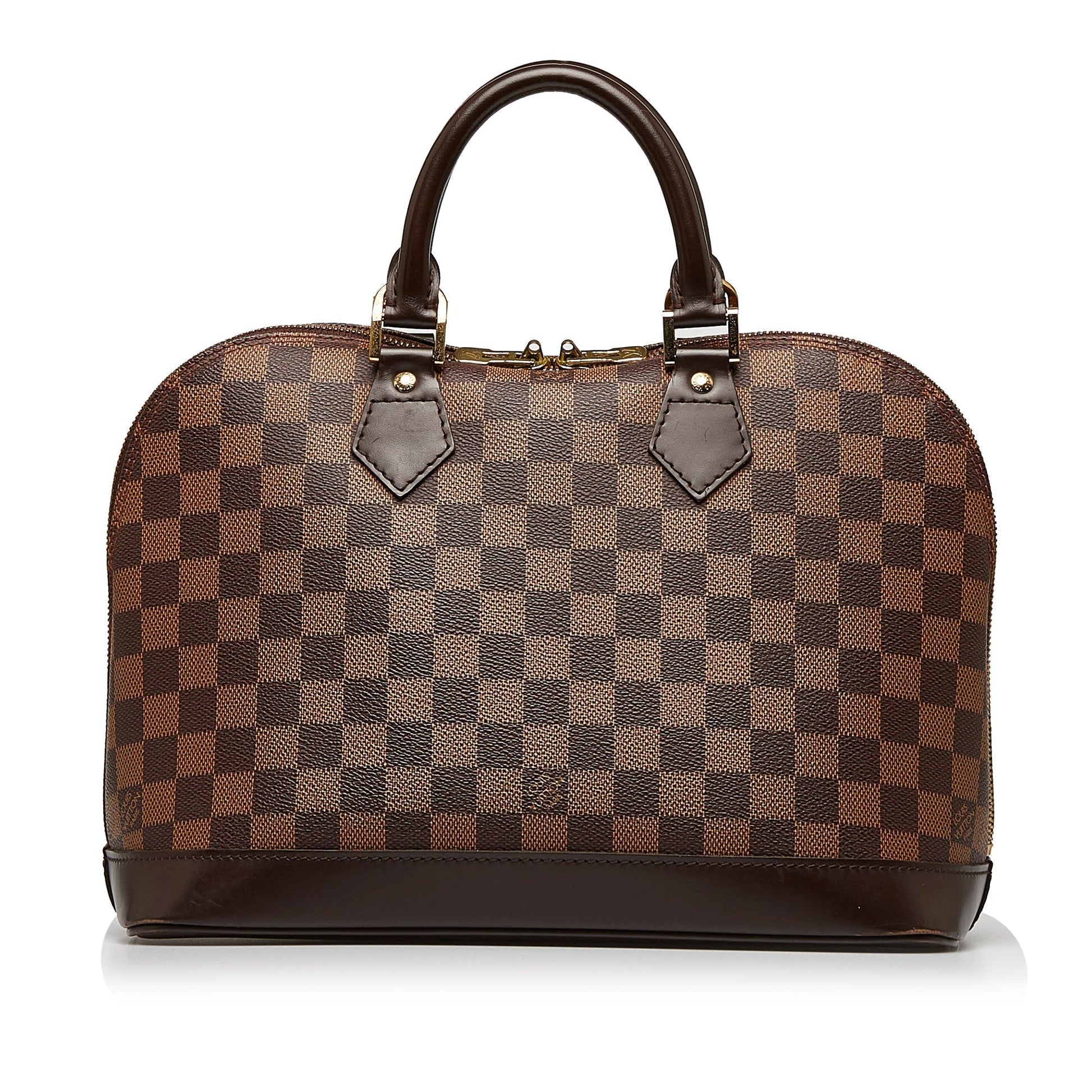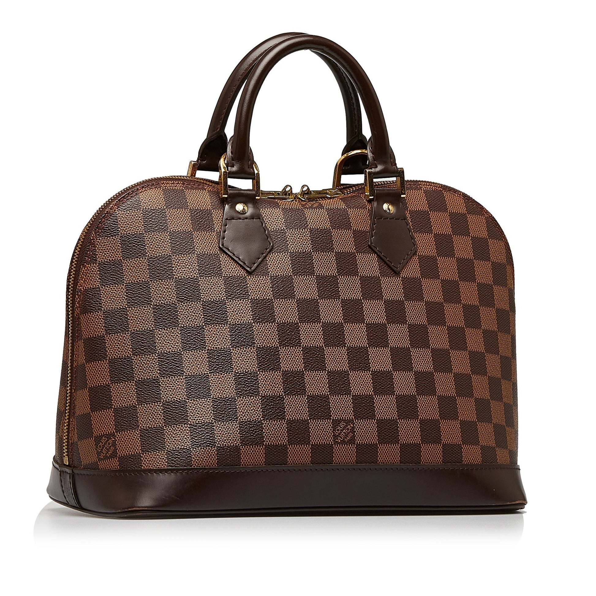 The Alma PM features a damier ebene canvas body with leather trim, rolled leather handles, a top zip closure, and interior slip pockets.
