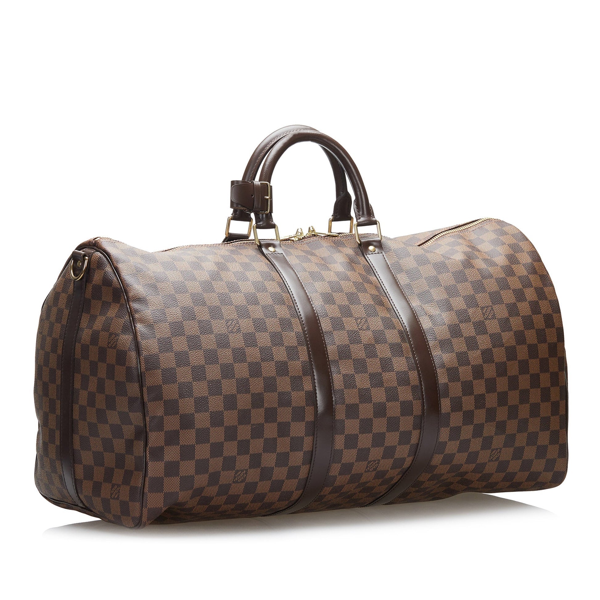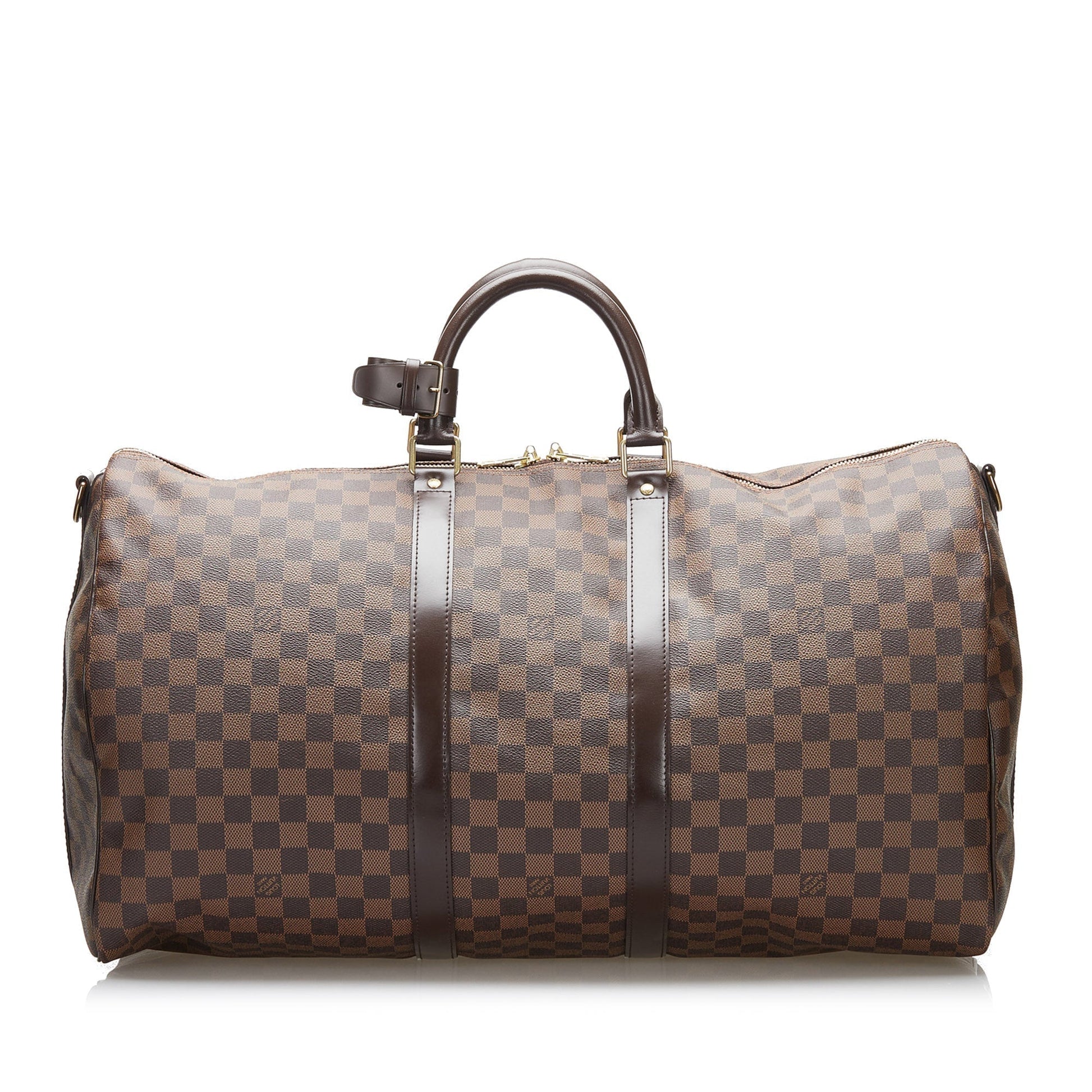 The Keepall Bandouliere 55 is crafted of Damier Ebene canvas with leather trim, features rolled leather handles, a detachable flat strap, and a top zip closure.