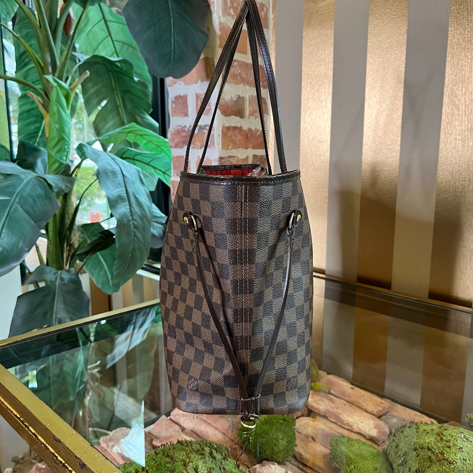 The Louis Vuitton Neverfull MM in Damier Ebene with Cherry Red lining is a timeless and versatile tote, crafted from the signature checkered canvas with dark brown leather trims, featuring a spacious interior, adjustable side laces, and vibrant red lining for a bold, sophisticated look. Fair Condition.