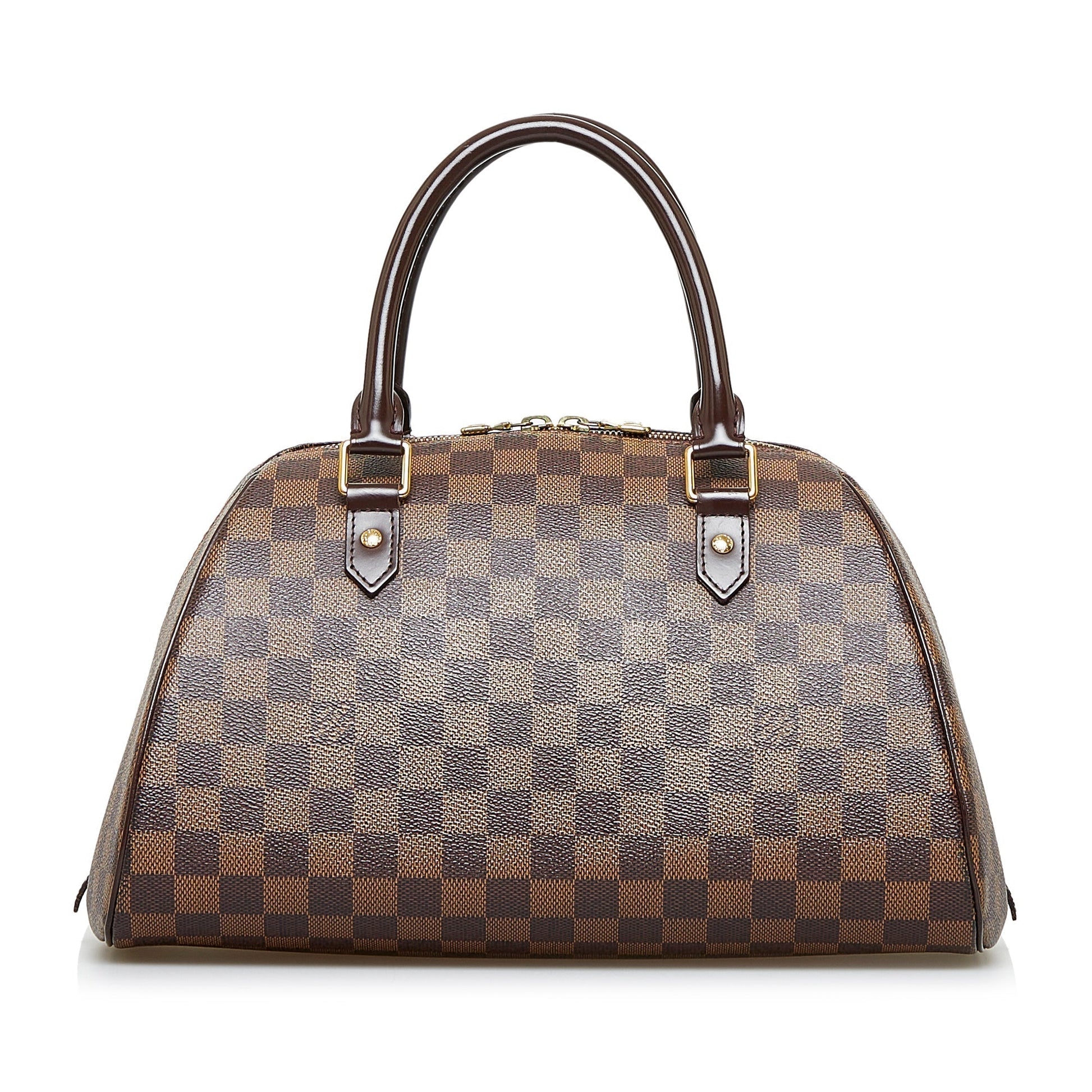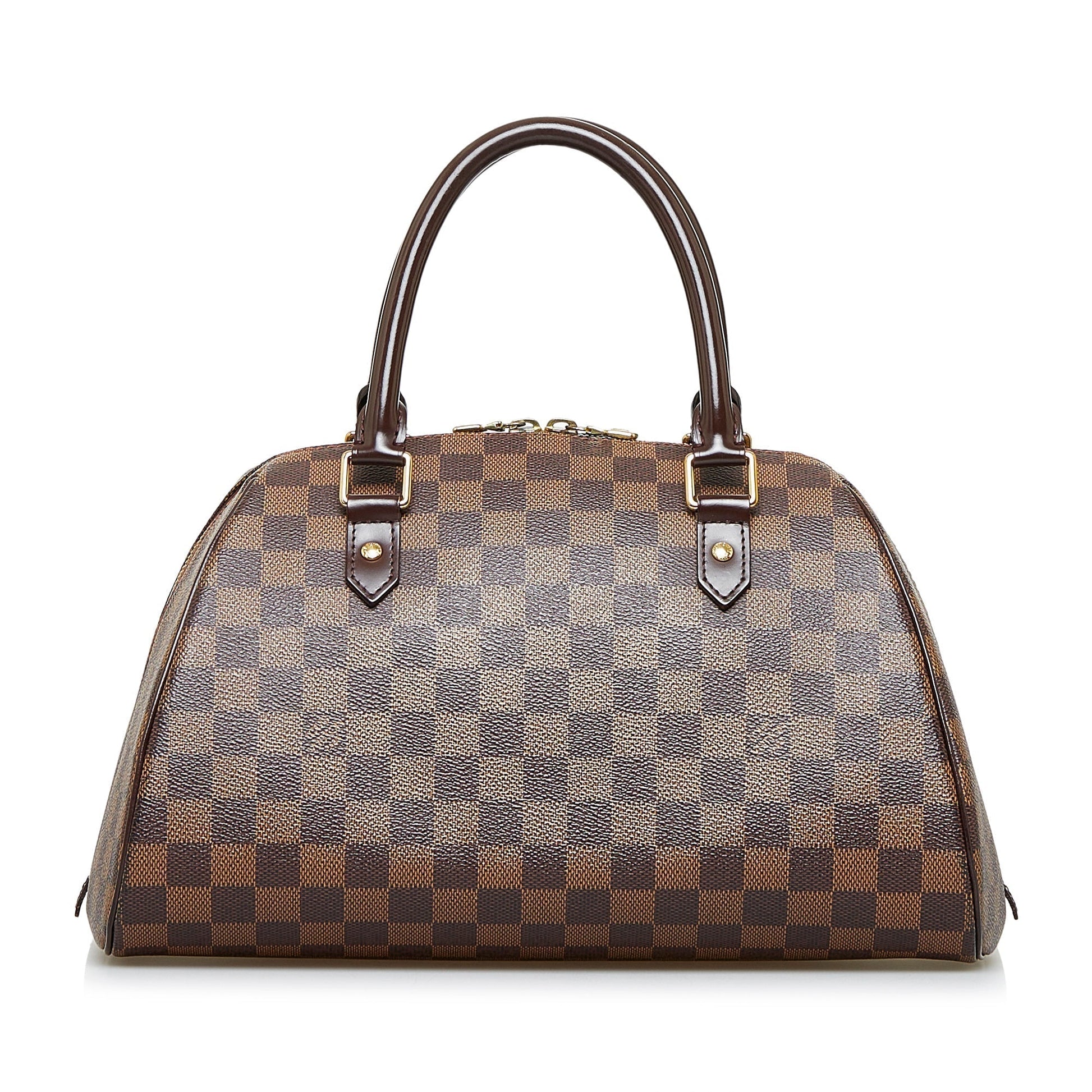 The Ribera MM features a damier ebene canvas body, rolled leather handles, top zip closure, and an interior slip pocket.