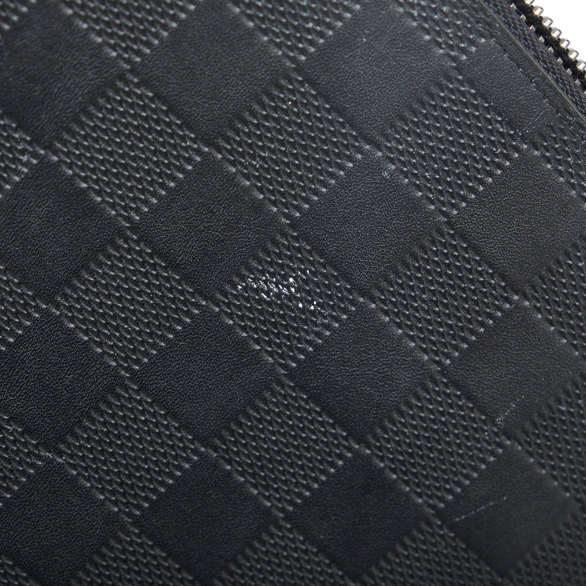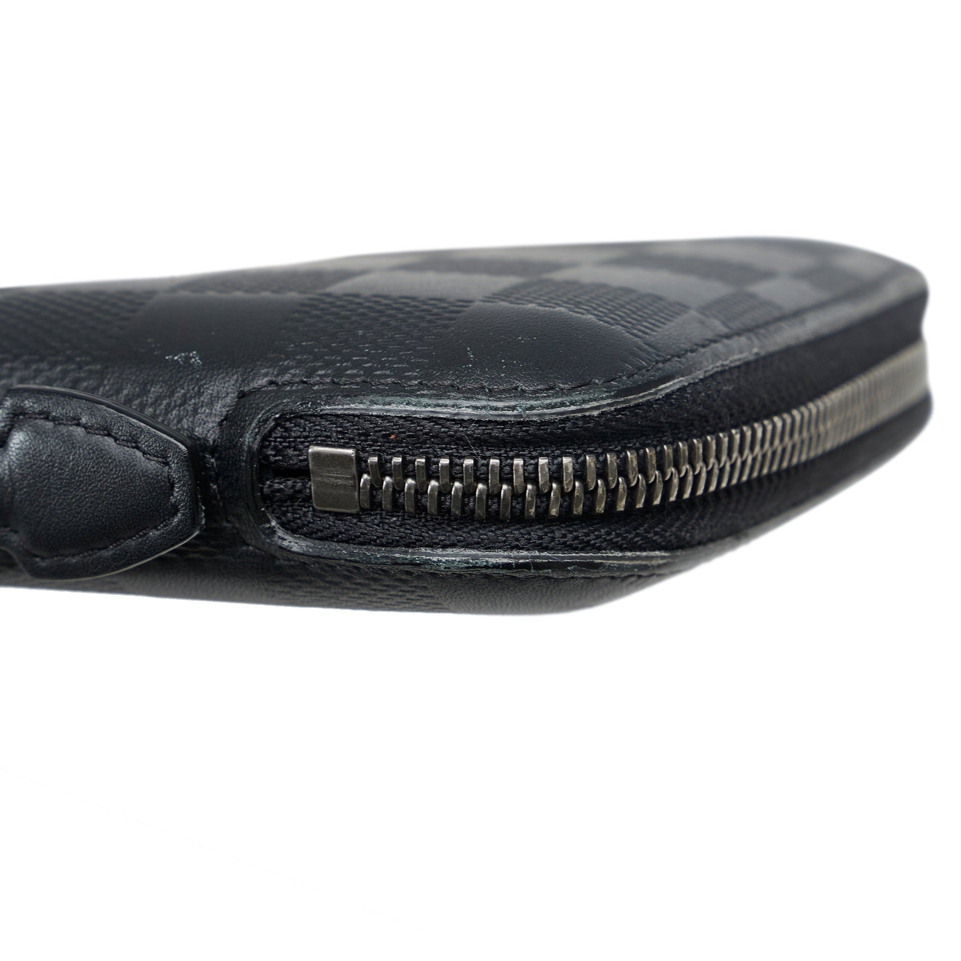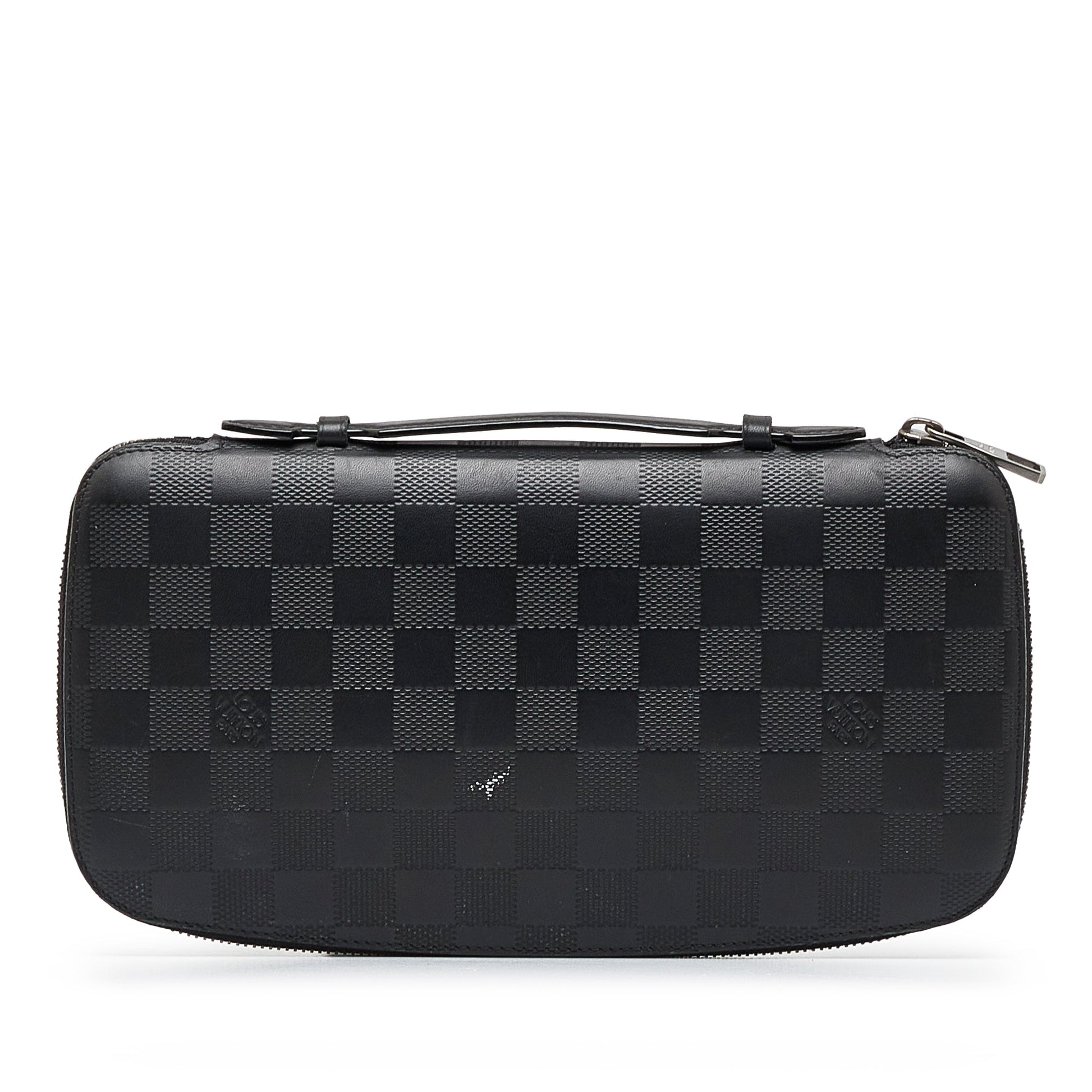 The Zippy XL features a damier leather body, a flat leather top handle, a zip around closure, an interior zip compartment, interior bills compartments, and interior card slots.