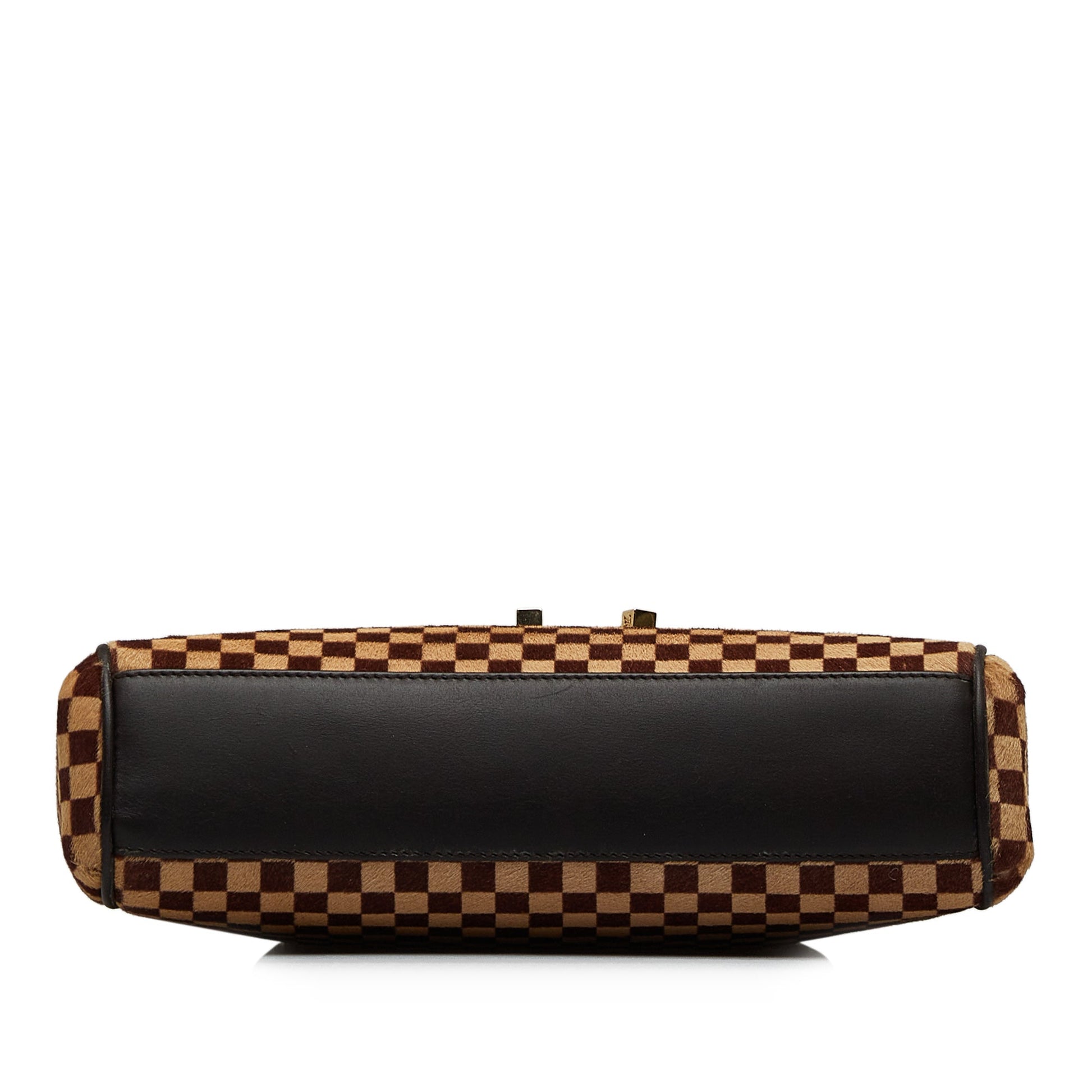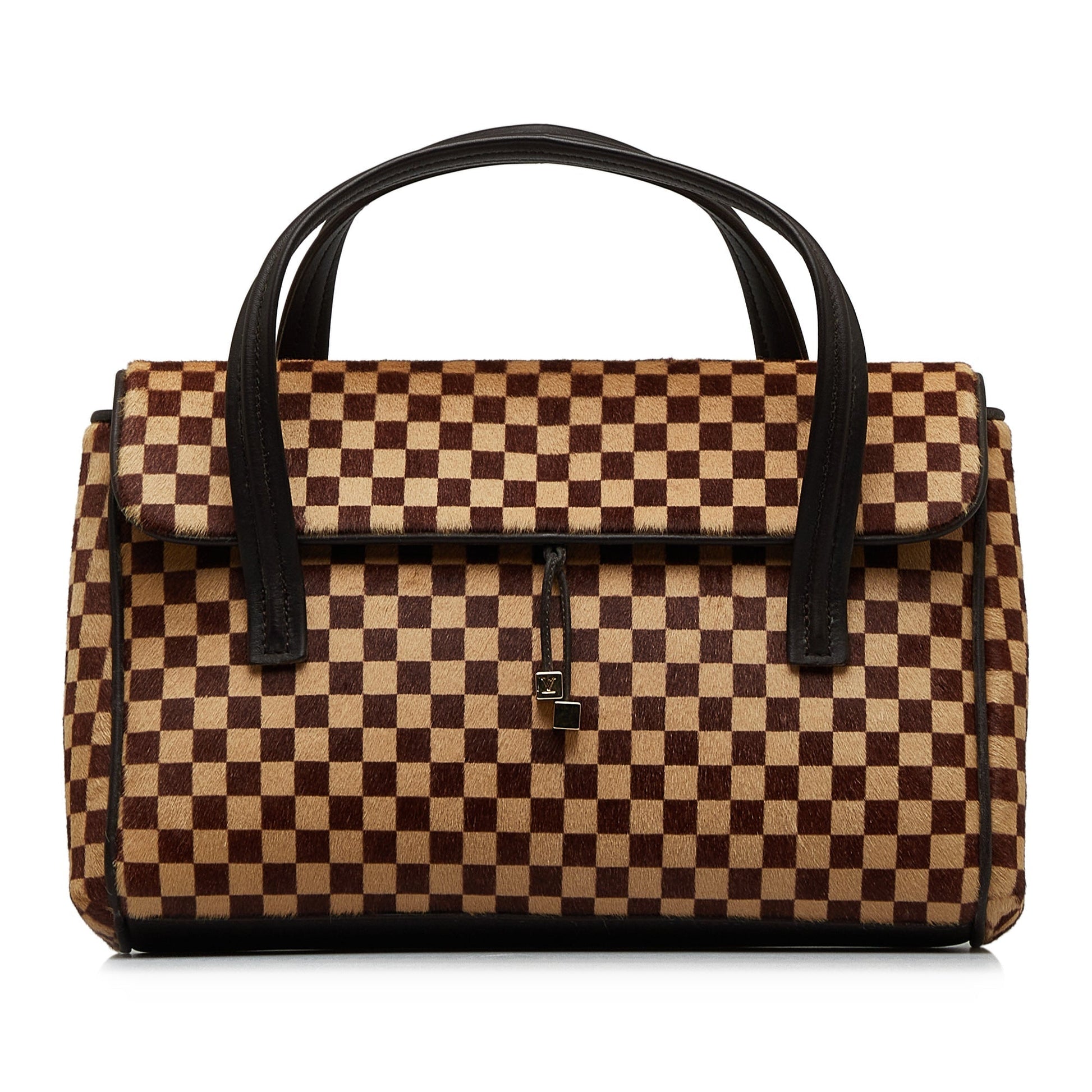 The Lionne features a damier sauvage pony hair body, leather handles, a front flap with tassels and a magnetic closure, an exterior back slip pocket, and an interior open pocket.