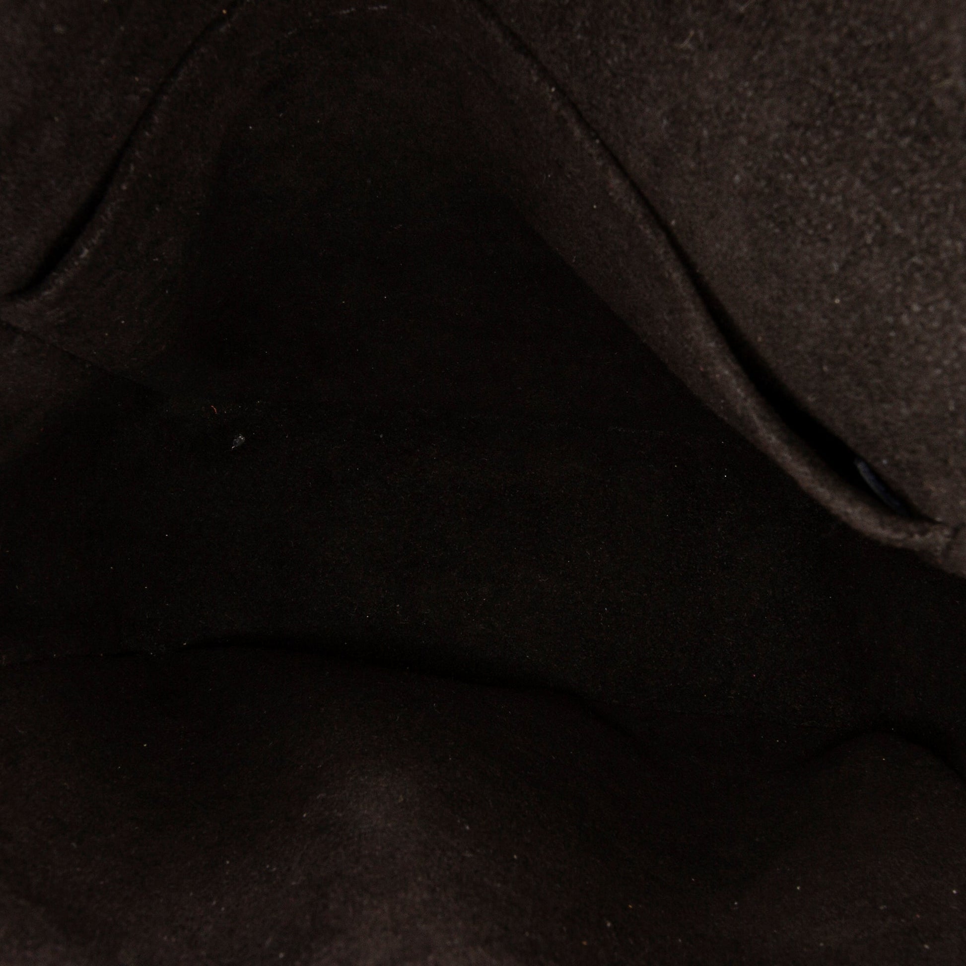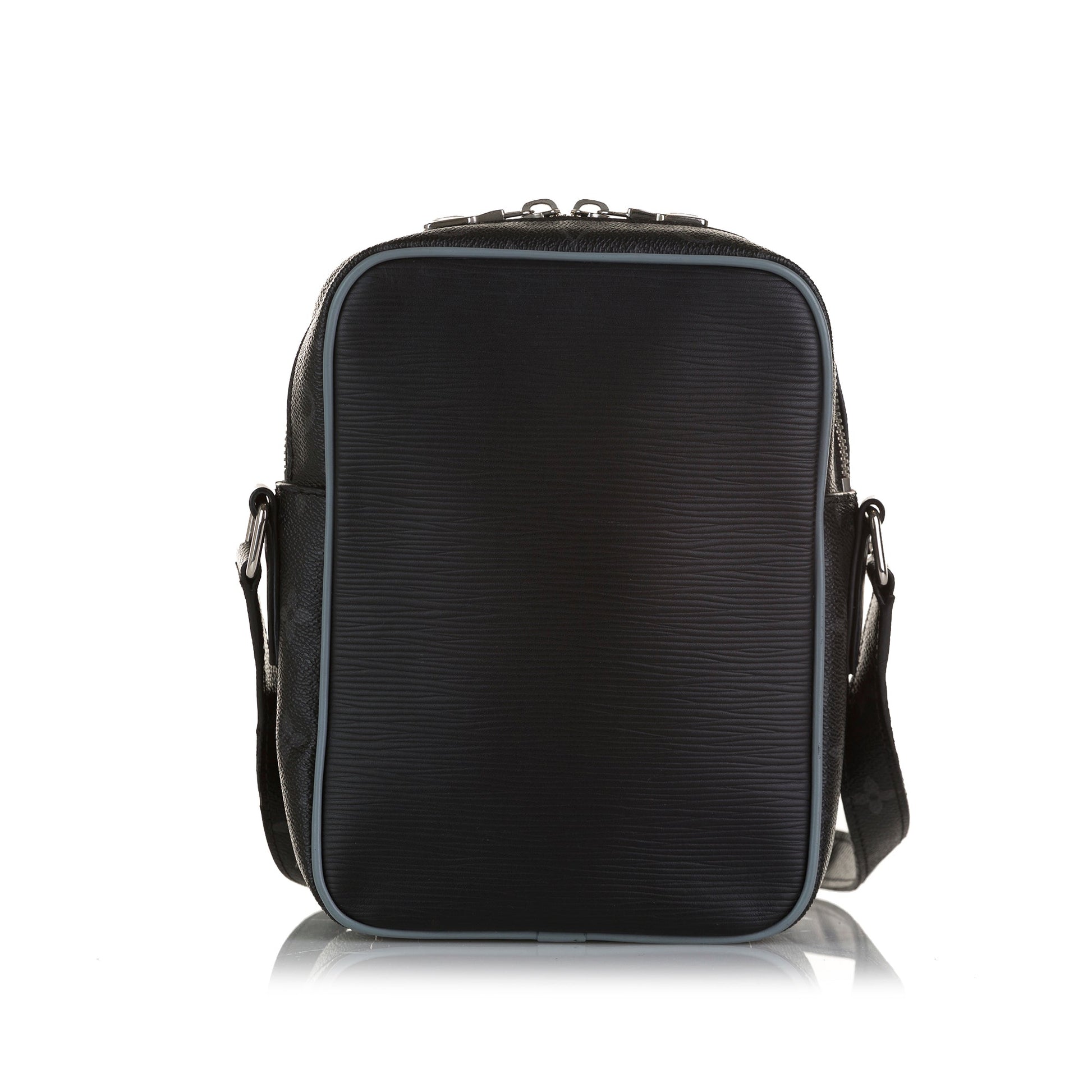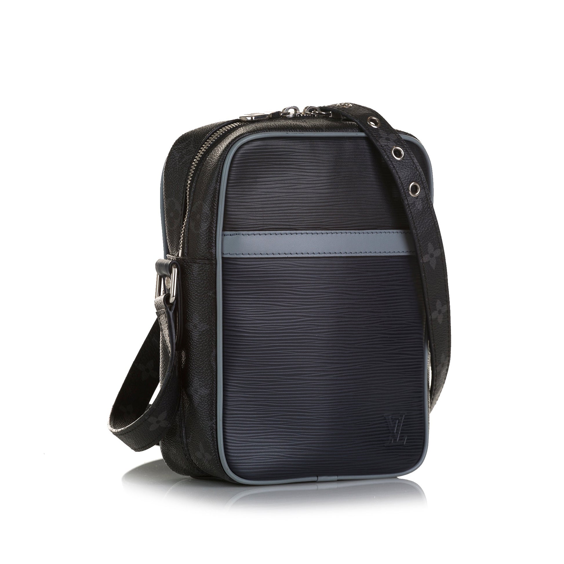 The Danube has a blue epi leather body with monogram canvas trim, an exterior front with slip pocket, an adjustable shoulder strap, and a top zipper closure.